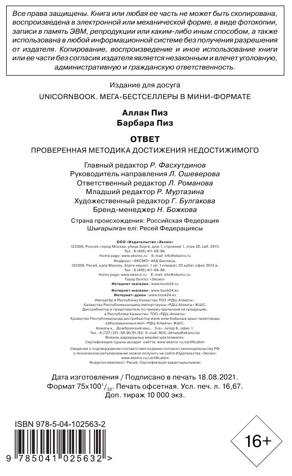 Ответ. Проверенная методика достижения недостижимого (Пиз Аллан , Мельник Элеонора Игоревна (переводчик)); БОМБОРА, 2021