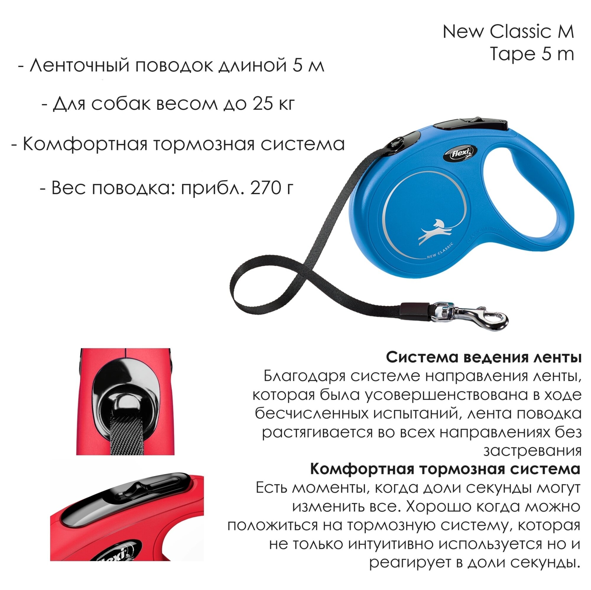 Рулетка Flexi New Classic M, 5 м, 25 кг, лента, розовый.Классическая рулетка Флекси для небольших и средних собак. Поводок выполнен полностью из нейлоновой ленты по всей длине. На конце мощный стальной карабин-ключик. Запатентованная система блокировки поводка Flexi значительно упрощает прогулки с собакой.Корпус рулетки из высокопрочной пластмассы без острых углов и зазоров. Выпускается в четырех расцветках: черный, красный, синий, розовый. Каждый элемент корпуса тщательно продуман - это позволяет быть рулетке эргономичной, лежать удобно в руке и максимально точно контролировать собаку во время прогулки. Отверстие, через которое проходит лента также продумано таким образом, чтобы перекрученный поводок не проходил внутрь.Нейлоновая лента используется по всей длине поводка. Особое плетение тесьмы, специально разработанное компанией Flexi, не позволяет ей растягиваться, скручиваться и впитывать грязь и влагу. Карабин используется заведомо мощный, так как эта деталь испытывает значительные нагрузки. Крепление карабина к полотну также продумано - прошито, проклеено и обжато пластиковым хомутом. Крепление ленты внутри рулетки-поводка сверх надежное. Если не допускать рывка собаки на полную длину, то гарантия длительного использования обеспечена.Запатентованная система фиксации и торможения поводка позволяет управлять рулеткой одной рукой не напрягаясь. В одной кнопке совмещен тормоз и фиксатор. Механизм настолько прост и надежен, что, по отзывам покупателей работает даже тогда, когда рулетка полностью разрушена.Основной причиной выхода из строя всех типов рулеток можно назвать:Перегрызание собакой ленты или троса;Привязывание собаки с помощью рулетки;Физическое разрушение рулетки, например, когда собака вырвалась и волочит рулетку за собой.Обращайтесь бережно с рулеткой Флекси. Немецкие инженеры сделали всё, чтобы вам было комфортно гулять с собакой.