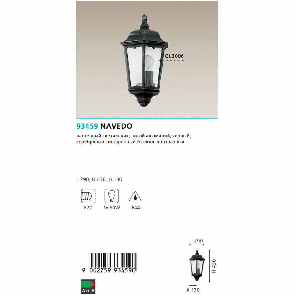 Настенный фонарь уличный Navedo - продукт известной компании Eglo (Австрия). Имеет максимальную мощность 60 Вт, освещает площадь до 3 кв. м. Отлично подойдет для таких мест, как дача, фасад, веранда и беседка. Впишется в интерьеры следующих стилей: классический.