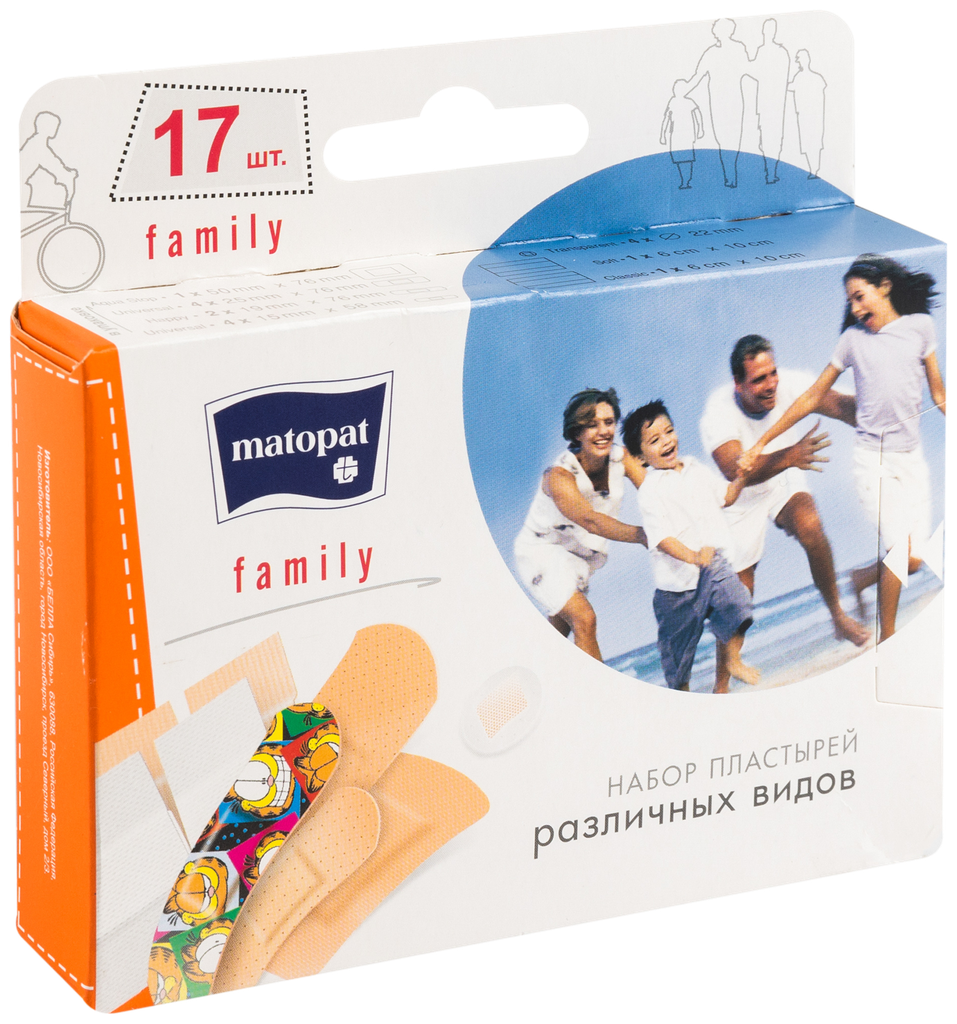 Набор пластырей Matopat Family незаменим для всей семьи — как дома, так и в поездках. Пластыри отлично защищают рану от загрязнения, а эластичная микропористая основа позволяет коже “дышать”. Большой выбор пластырей разных размеров на различных основах обеспечивает удобство перевязки в любых ситуациях.В набор входят пластыри, используемые в быту чаще всего:SOFT — деликатныеCLASSIC — классическиеAQUA STOP — водостойкиеUNIVERSAL — универсальныеTRANSPARENT — незаметные на кожеHAPPY — цветные для детейВ наборе: 17 шт. 6-и размеров.