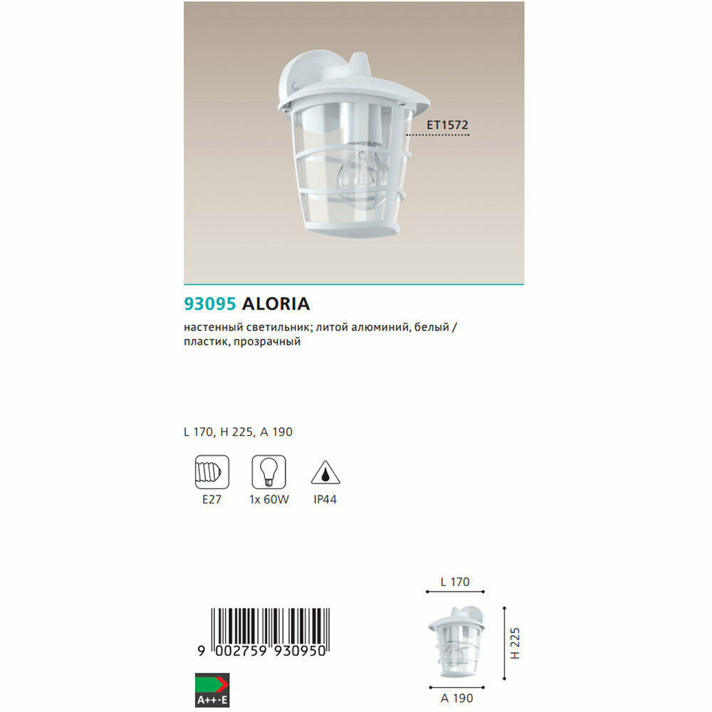 Настенный фонарь уличный Aloria - продукт известной компании Eglo (Австрия). Имеет максимальную мощность 60 Вт, освещает площадь до 3 кв. м. Отлично подойдет для таких мест, как дача, фасад, веранда и беседка. Впишется в интерьеры следующих стилей: модерн.