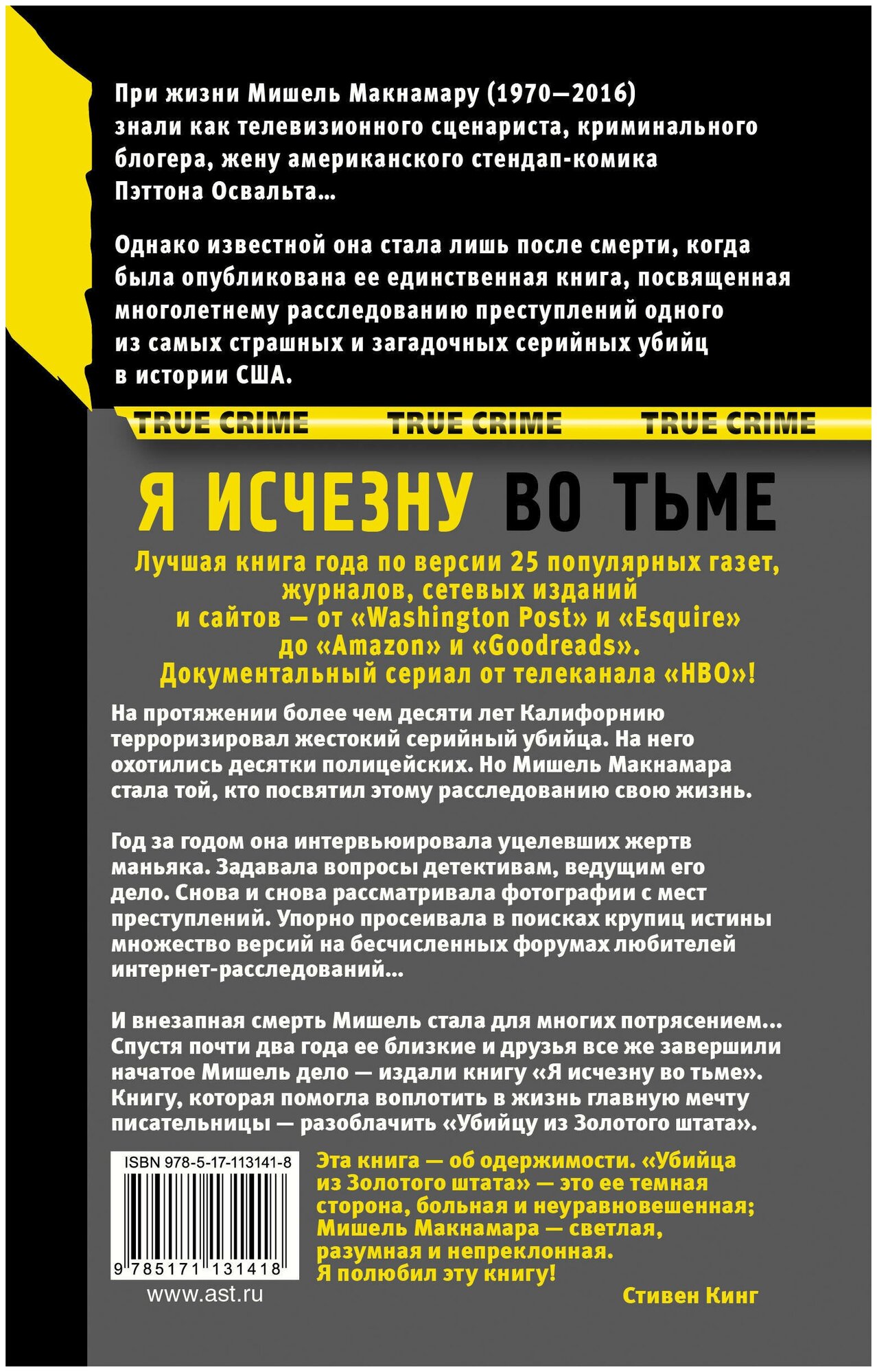 На протяжении более чем десяти лет Калифорнию терроризировал жестокий серийный убийца. На него охотились десятки полицейских. Но Мишель Макнамара стала той, кто посвятил этому расследованию свою жизнь. Год за годом она интервьюировала уцелевших жертв маньяка. Задавала вопросы детективам, ведущим его дело. Снова и снова рассматривала фотографии с мест преступлений. Упорно просеивала в поисках крупиц истины множество версий на бесчисленных форумах любителей интернет-расследований… И внезапная смерть Мишель стала для многих потрясением... Спустя почти два года ее близкие и друзья все же завершили начатое Мишель дело — издали книгу "Я исчезну во тьме". Книгу, которая помогла воплотить в жизнь главную мечту писательницы — разоблачить "Убийцу из Золотого штата".