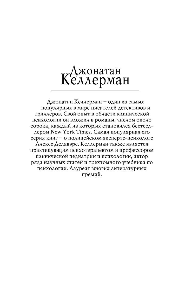 Джонатан Келлерман - один из самых популярных в мире писателей детективов и триллеров. Свой опыт в области клинической психологии он вложил в более чем 40 романов, каждый из которых становился бестселлером New York Times. Практикующий психотерапевт и профессор клинической педиатрии, он также автор ряда научных статей и трехтомного учебника по психологии. Лауреат многих литературных премий.