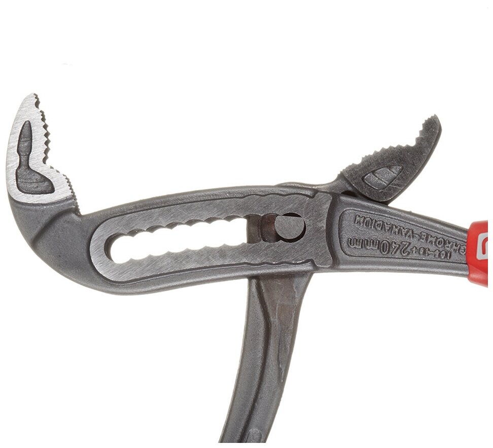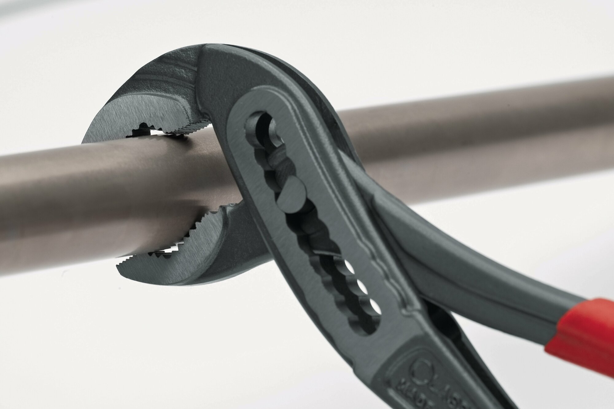 Прочные переставные клещи с утопленным безопасным шарниром для максимальной нагрузки. С держателем для гвоздей и проволоки. Двойные зубчатые захватные губки. Зубцы дополнительно прошли индуктивную закалку. Оптимальная геометрия зева с самостоятельно зажимающимися зубьями для надежного захвата. Оптимальная точка вращения, небольшие усилия. Защита от защемления для безопасной работы, предотвращает травмы вследствие раздавливания. Утопленный шарнир с широкими направляющими поверхностями. Ручки с эргономичным многокомпонентным покрытием SoftGripp. Из специальной инструментальной стали, кованой, закаленной в масле.