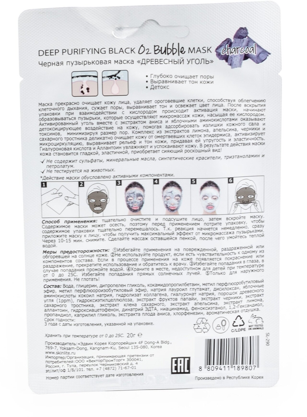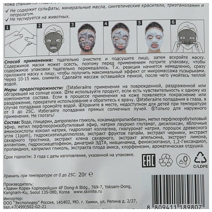 | Способ применения | Тщательно очистите и подсушите лицо, затем вскройте маску. Содержимое маски может осесть, поэтому перед применением потрите упаковку, чтобы содержимое упаковки тщательно перемешалось. Т.к. реакция начнется немедленно, сразу приложите маску к лицу, чтобы получить максимальный эффект от микромассажа пузырьками. Через 10-15 мин. снимите. Сделайте массаж оставшейся пенкой, после чего умойтесь теплой водой. |