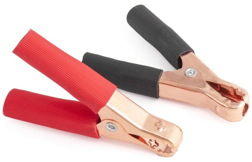 Зажимы клемм аккумулятора с цветной маркировкой ролярности. Изготовлены из оцинкованой стали с медным напылением. Оснащены резиновой изоляцией ручек. В коомплект вхожит 2 шт. Размер клемм 8 см.Зажимы полезны при присоединении зарядных устройств, а также тестеров, датчиков, проводов прикуривания и другого электрического оборудования. Рассчитаны на ток 50 А. Клеммы имеют цветовую маркировку полярности: красные и черные.Чтобы воспользоваться зажимом с него необходимо снять изоляцию кабеля и присоединить ее к зажиму на 3 см в длину. Затем снять с зажима изоляционную ручку и надеть на предварительно защищенный конец кабеля, который вставить под контактное кольцо на конце зажима. После изоляционные лепестки зажимаются на незачищенной части кабеля и контактном кольце на проводнике. Затем захват надвигается на рукоятку зажима и закрепляется саморезом.