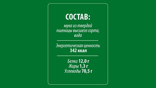 | Состав | Мука из твердой пшеницы для макаронных изделий высшего сорта, вода питьевая. |