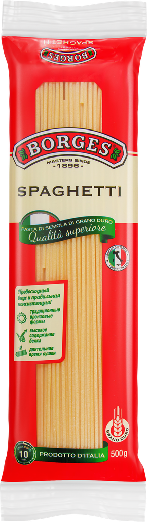 Паста Borges изготавливается из итальянской пшеницы твердых сортов с высоким содержанием белка в соответствии с неизменными традициями качества Borges. Благодаря использованию в процессе производства бронзовых форм и особой технологии бережной сушки паста Borges обладает непревзойденным вкусом, сохраняет форму при варке и удерживает соус на своей поверхности.