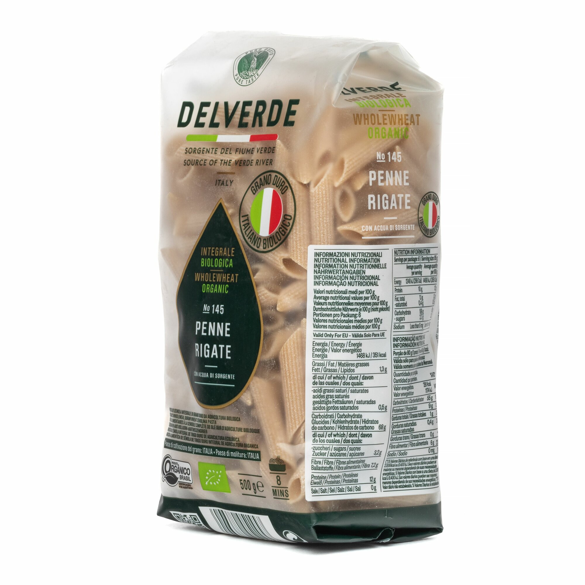 Пенне ригате с отрубями имеют натуральный состав в виде чистой родниковой воды и пшеницы твердых сортов. Продукт богат полезными углеводами, которые придают энергию и могут употребляться даже в рамках диетического питания. Сырье производится на частных фермах Италии, поэтому вы сможете создавать у себя на кухне настоящие шедевры традиционной кухни.