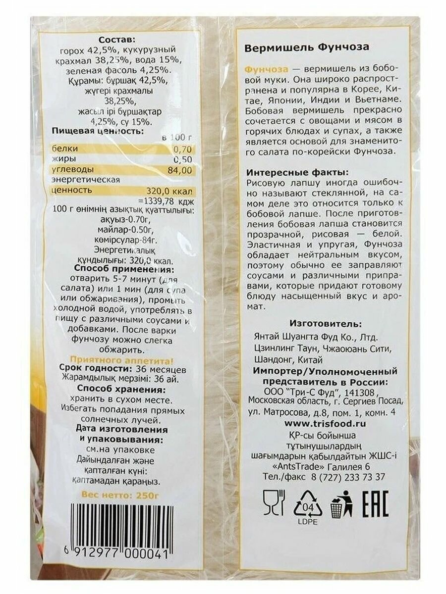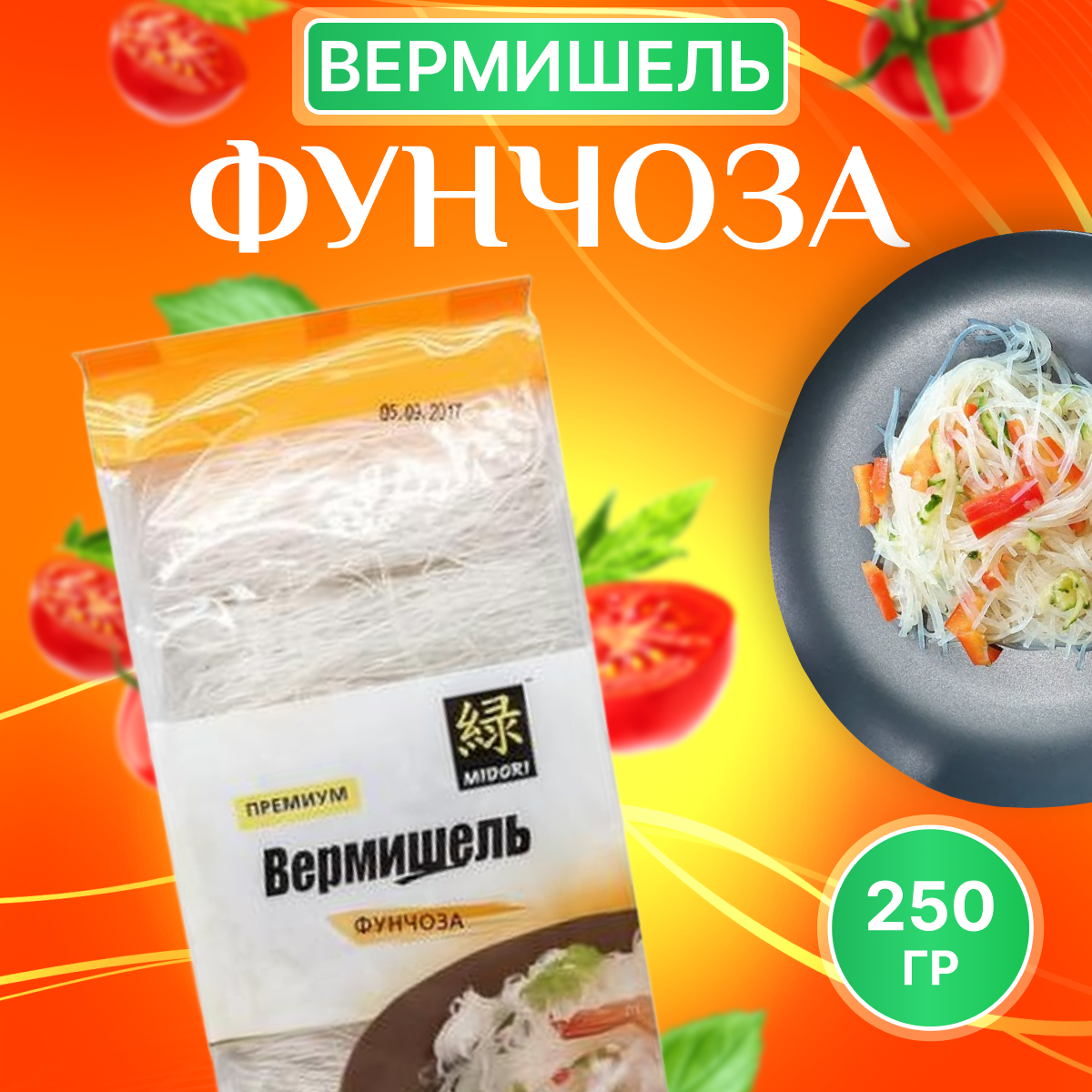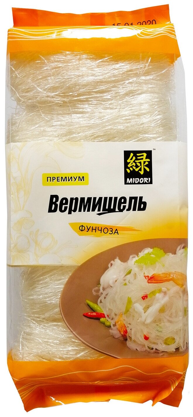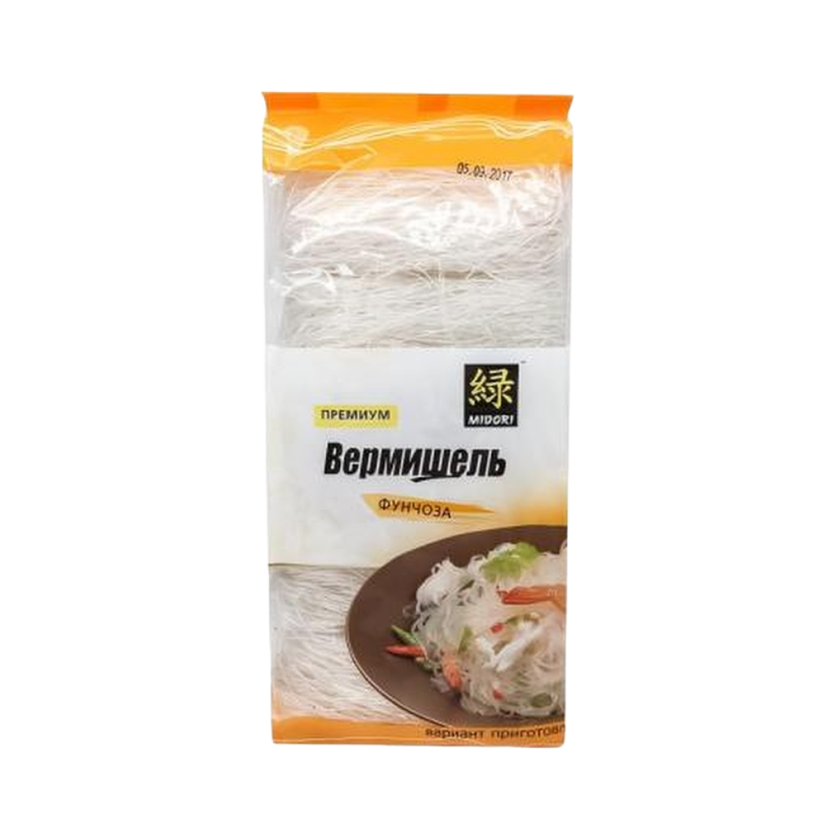 Питательная вермишель фунчоза премиум торговой марки «Мидори» представляет собой тоненькую лапшу, которая очень популярна во многих азиатских странах. Такая вермишель – основа многих фирменных блюд в Корее, Китае, Японии, Индии и Вьетнаме. Из нее делают разнообразные супы, подают в качестве гарнира, и, конечно, используют в виде основы для известного салата «Фунчоза». Создана вермишель из натуральных ингредиентов: перемолотого в муку гороха, фасоли, кукурузного крахмала и воды. Такой состав делает ее действительно полезной и питательной. Это здоровая и натуральная еда для вегетарианцев и всех, кто соблюдает религиозные посты и придерживается основ здорового питания. При этом вермишель из натуральной бобовой муки часто называют «стеклянной» из-за своего прозрачного внешнего вида. Многие ошибочно полагают, что только вермишель из риса способна быть прозрачной, хотя на деле она плотного белого оттенка. А бобовая вермишель всегда упругая, эластичная и прозрачная. В чем польза вермишели фунчоза премиум Мидори? В первую очередь стоит заметить, что вермишель фунчоза – полностью натуральная еда, не содержащая искусственных добавок и усилителей вкуса. Она создана на базе бобовых, которые богаты витаминами группы В, а также клетчаткой, макро и микроэлементами, улучшающими работу всех систем организма. Бобовая мука, на основе которой создается эта своеобразная вермишель, способствует:улучшению пищеварительных процессов; выведению токсинов и шлаков из организма; уменьшению уровня сахара в крови; укреплению иммунной системы организма; активизации обменных реакций в организме, что часто приводит к нормализации веса. Все это делает вермишель на основе бобовых действительно полезной и питательной. Кроме того, клетчатка, которой богаты бобовые, помогает желудку насытиться меньшим объемом пищи и снизить чувство голода. Это делает фунчозу незаменимым продуктом питания для тех, кто стремится нормализовать свой вес, улучшить самочувствие. Приобрести полезную вермишель фунчоза можно в нашем магазине здорового питания «Ашаиндия». Способ приготовления Фунчозу используют как для первых блюд, так и для салатов или гарниров. Чтобы приготовить ее для салата, стоит отварить в подсоленной воде 5-7 минут, а затем вынуть, промыть в холодной воде и остудить. Для супа или же для дальнейшей обжарки можно отваривать вермишель минуту, а затем также промыть прохладной водой. Вермишель можно подавать и как отдельное блюдо, с различными приправами и соусами. В качестве гарнира может сочетаться с мясом, рыбой, овощами и морепродуктами. Состав Горох 42,5%, кукурузный крахмал 38,25%, вода 15%, зеленая фасоль 4,25%.