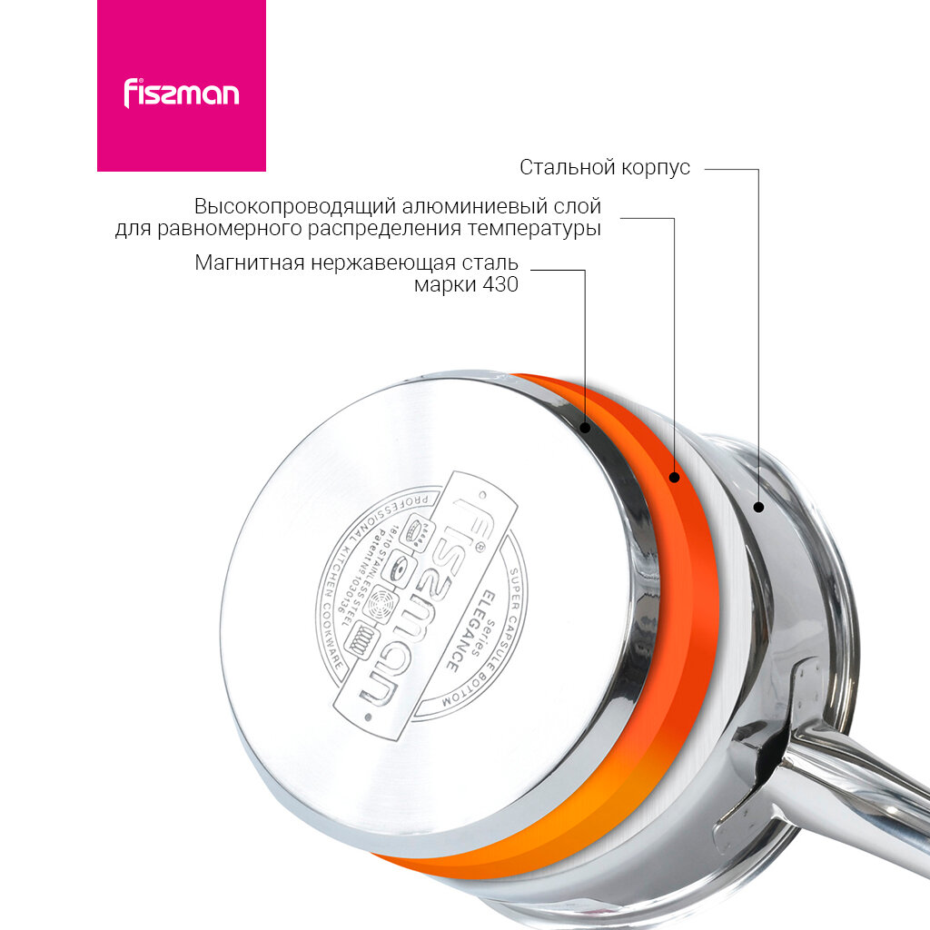 Компания FISSMAN ценит своих покупателей и относится к качеству своей продукции с особым вниманием. Посуда серии BAMBINO сделана из самой безопасной высококачественной нержавеющей стали марки 18/10 (INOX304), обладает коррозийной стойкостью, очень легка в уходе. Многослойное капсульное дно обеспечивает равномерный нагрев и распределение тепла благодаря алюминиевой прослойке, раскрывая вкусовые качества блюда и сохраняя все полезные свойства продуктов, а индукционный слой делает посуду универсальной для всех типов плит. Изделия BAMBINO - это мини-версии, отвечающие самым высоким требованиям. Создавая коллекцию, разработчики FISSMAN следовали главным принципам, на которых строится репутация бренда, - надежность и экологичность. • Стальной корпус 18/10 (INOX304) (высококачественная нержавеющая сталь) • Многослойное индукционное дно (для всех типов плит, высокая теплопроводность) • Мерная шкала (для контроля количества жидкости) • Прозрачная ударопрочная стеклянная крышка с паровыпуском позволяет наблюдать за готовностью пищи, не открывая посуду, тем самым, исключая попадания брызг на кожу и одежду • Прочные и удобные для захвата литые стальные ручки • Ковш удобен для варки яиц, каш, макарон в небольших количествах, кипячений воды и молока • В маленькой посуде удобно хранить готовую еду, она не занимает много места в холодильнике • Мини-изделия можно взять с собой на отдых, в путешествие, на природу • Посуда BAMBINO безвредна, легка, прочна, прекрасно моется и имеет долгий срок службыПривлекательный и практичный дизайн посуды серии BAMBINO найдет свое место на любой кухне и порадует Ваших маленьких поваров. Приобретая продукцию компании FISSMAN, Вы делаете выбор в пользу качества и безопасности посуды, в которой Вы будете готовить для себя и Вашей семьи.