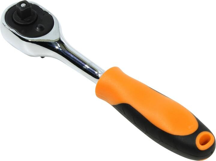 Трещоточная рукоятка с флажковым переключателем и композитной, оригинальной двухкомпонентной бензомаслостойкой рукояткой, обеспечивающей надежный захват инструмента при работе. Изделие соответствует требованиям ГОСТ 22402-77. Зеркальное хромоникелевое покрытие. Храповое колесо в 72 зубца, обеспечивающее 5° свободного хода и увеличенное пятно контакта храпового механизма, гарантирует большой запас прочности при высоком крутящем моменте. Устройство быстрого сброса обеспечивает легкую смену и надежно фиксирует насадку на приводе.