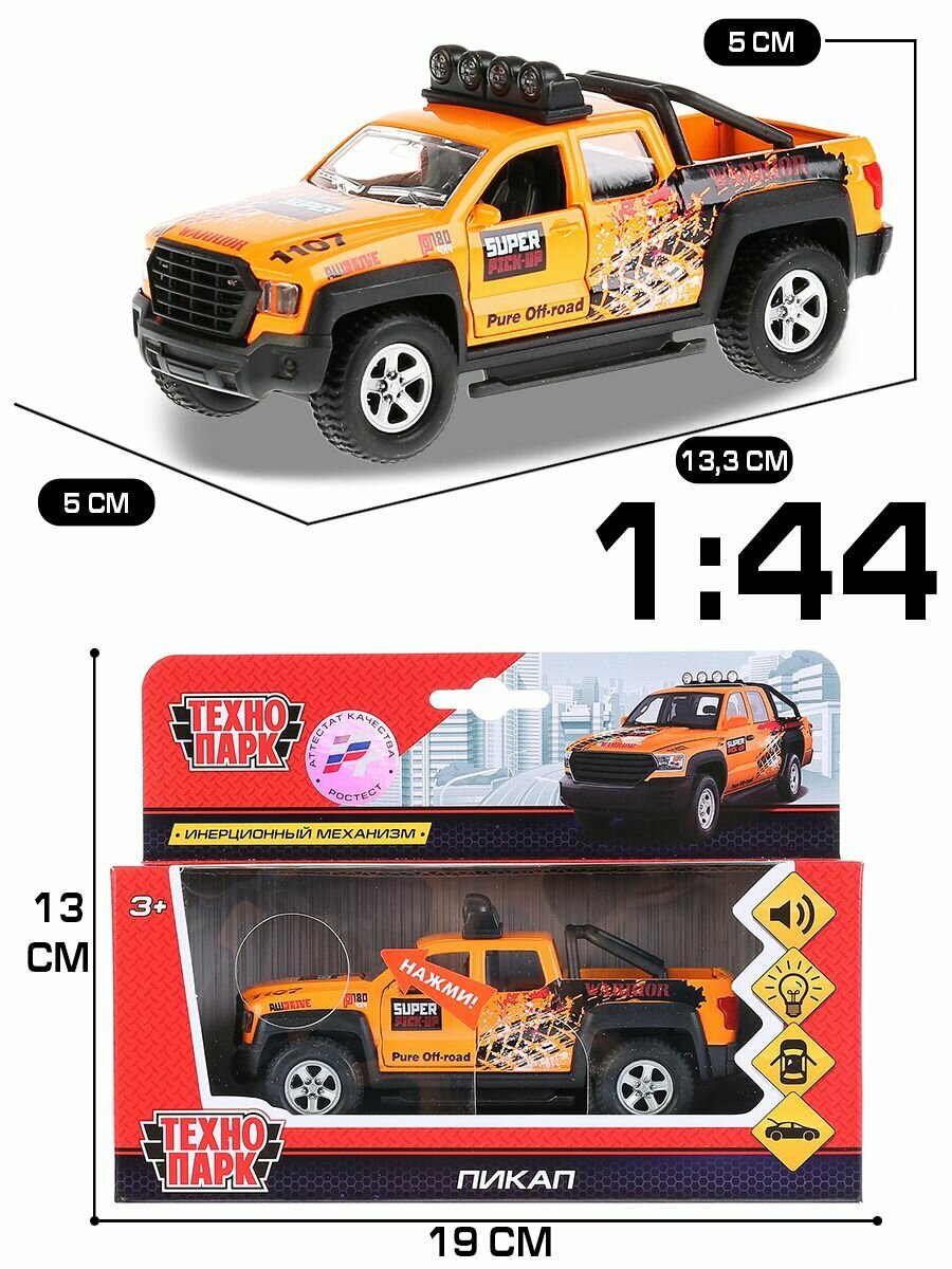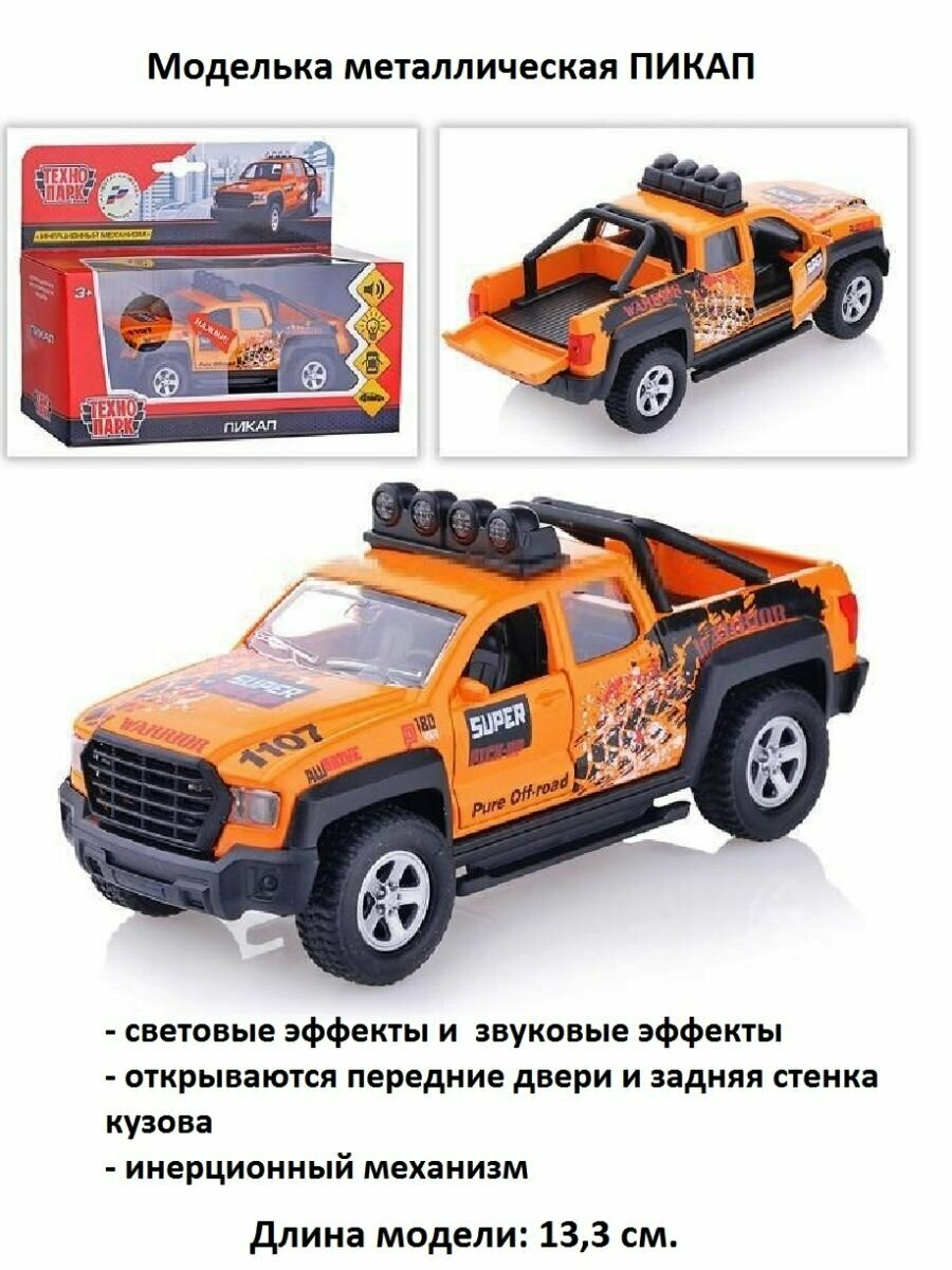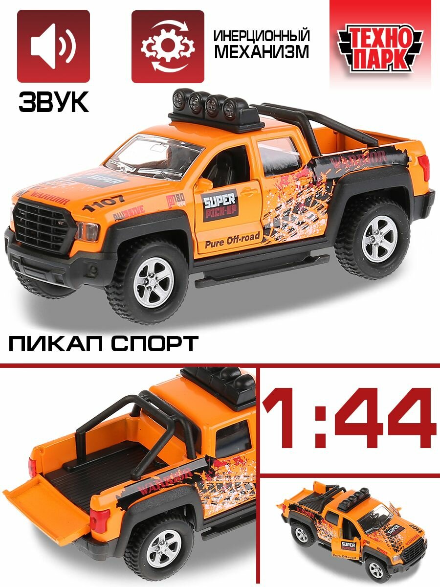 Машинка Пикап Спорт ТМ Технопарк представляет собой точную лицензионную копию настоящей. Это металлическая модель, выполненная в ярком цвете с рисунками. Оснащена зуковым и световым модулем: при нажатии на кнопку загораются лампочки и проигрываются звуки. У машинки открываются двери и багажник, можно рассмотреть салон внутри. Сверху установлены проблесковые маячки. Оснащена инерционным механизмом: если поставить машинку на ровную поверхность, потянуть за корпус и отпустить, то она поедет сама. Развивает мелкую моторику, воображение, расширяет кругозор.