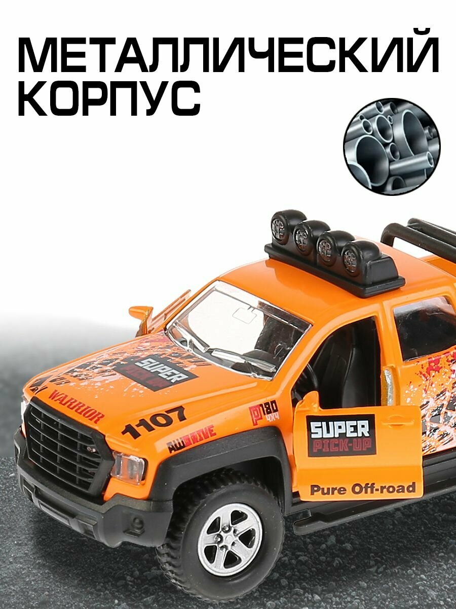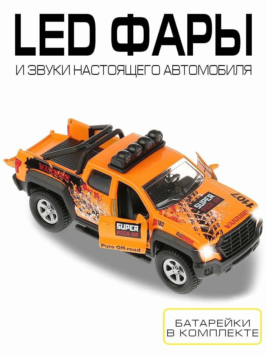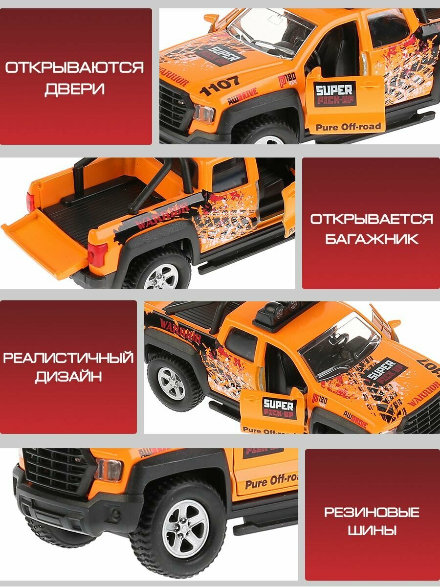 Машинка Пикап Спорт ТМ Технопарк представляет собой точную лицензионную копию настоящей. Это металлическая модель, выполненная в ярком цвете с рисунками. Оснащена зуковым и световым модулем: при нажатии на кнопку загораются лампочки и проигрываются звуки. У машинки открываются двери и багажник, можно рассмотреть салон внутри. Сверху установлены проблесковые маячки. Оснащена инерционным механизмом: если поставить машинку на ровную поверхность, потянуть за корпус и отпустить, то она поедет сама. Развивает мелкую моторику, воображение, расширяет кругозор.