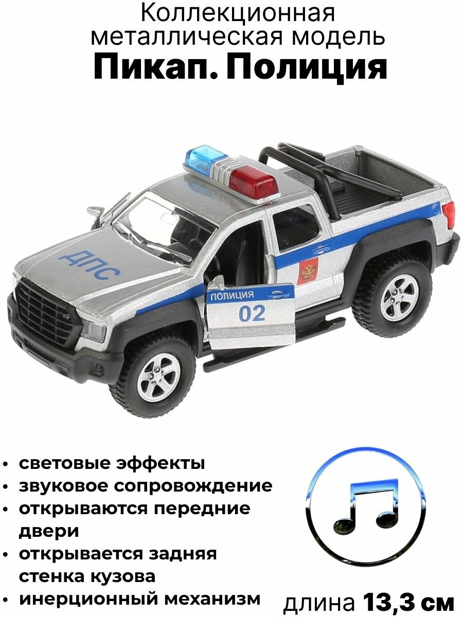 Машинка Пикап Полиция ТМ Технопарк представляет собой точную лицензионную копию настоящей. Это металлическая модель, выполненная в серебристом цвете с синей полоской, надписями ДПС и Полиция 102. Оснащена зуковым и световым модулем: при нажатии на кнопку загораются лампочки и проигрываются звуки. У машинки открываются двери и багажник, можно рассмотреть салон внутри. Сверху установлены проблесковые маячки. Оснащена инерционным механизмом: если поставить машинку на ровную поверхность, потянуть за корпус и отпустить, то она поедет сама. Развивает мелкую моторику, воображение, расширяет кругозор.