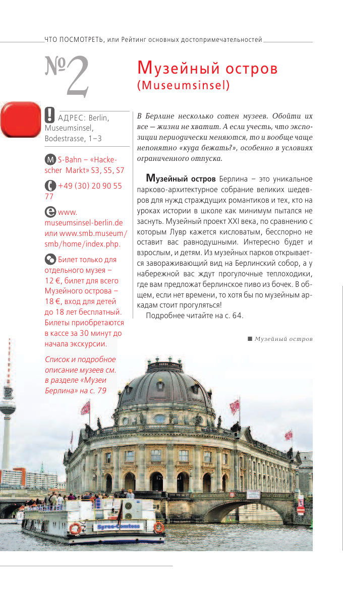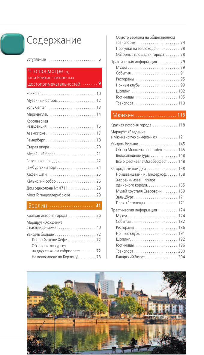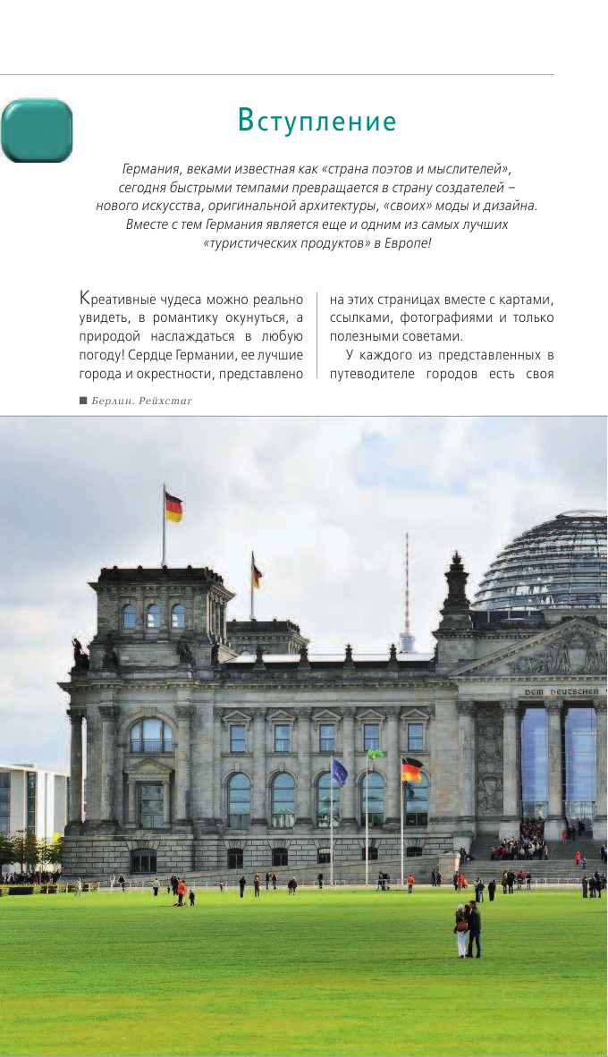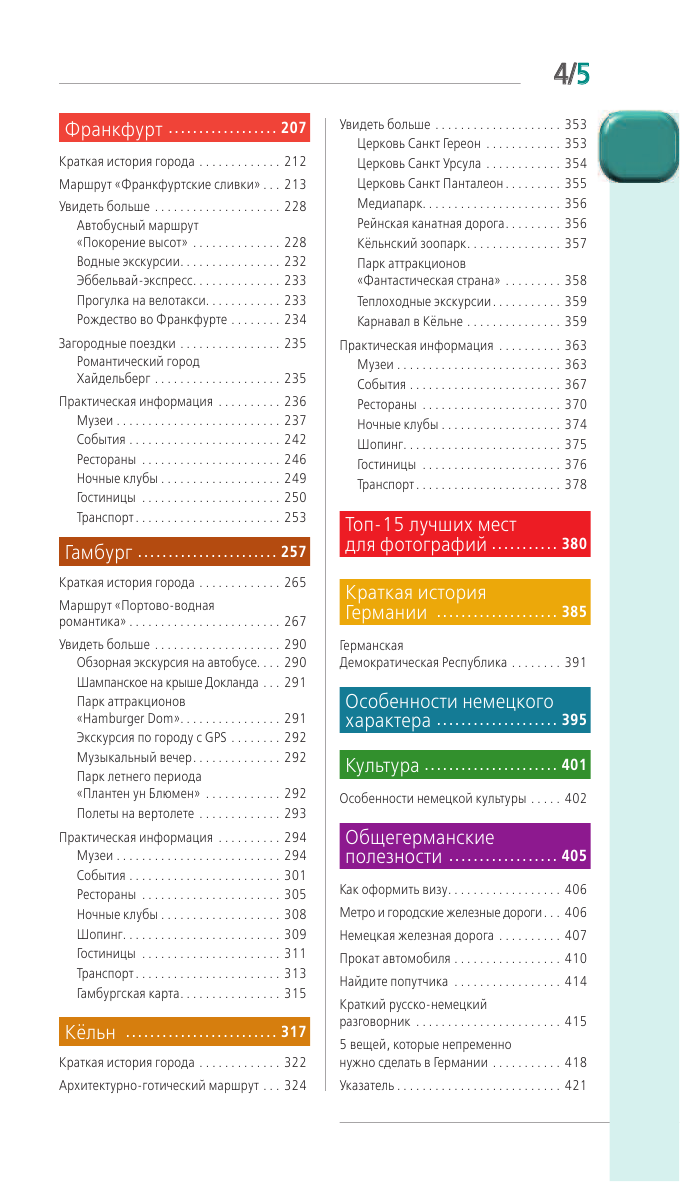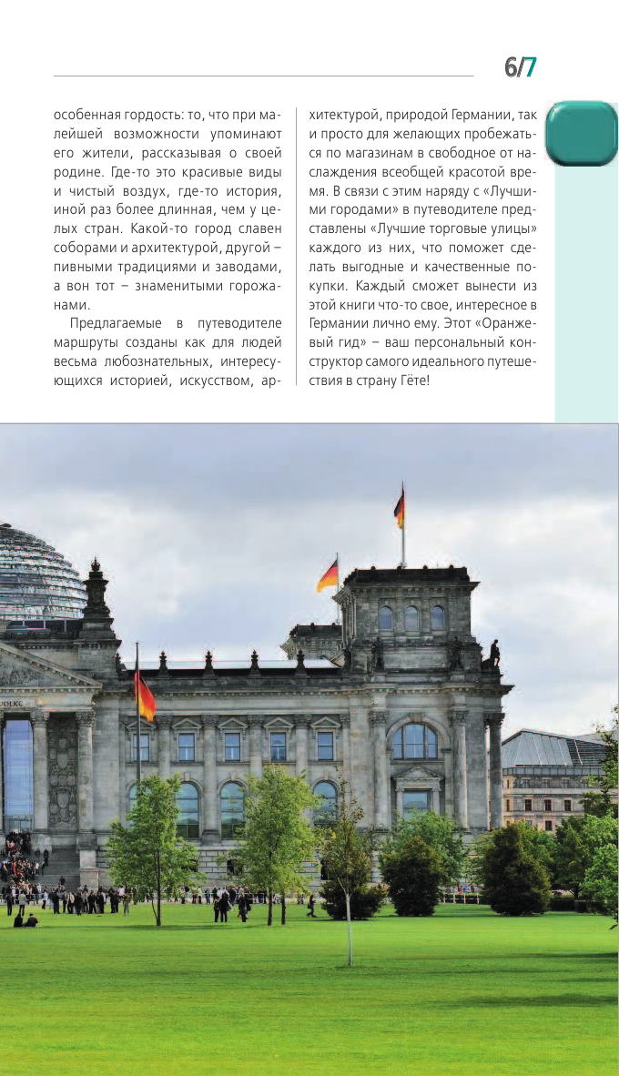 В описании сказано, что данный путеводитель покажет города и окрестности, на деле окрестностей не так много. Например, Берлин.Я не понимаю как можно не упомянуть и не рекомендовать к посещению дворец Сан-Суси в Потсдаме, "русскую деревню". Потсдам находится всего 20 минутах езды от центра по городской железной дороге. Данный путеводитель очень хорош, если ваш маршрут по стране включает все, перечисленные в заглавии города. Если вы планируете посещение одного из городов, то лучше приобрести путеводитель Оранжевого гида по конкретно взятому городу, тем более, что такие путеводители включают максимум информации и тематическое разнообразие маршрутов(проверено на себе).