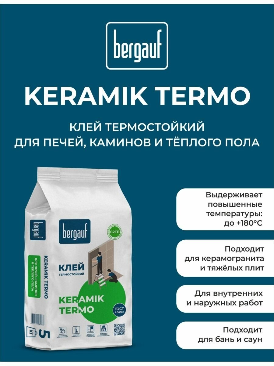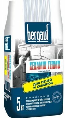 Клей Bergauf Keramik Termo предназначен для облицовки керамической плиткой, керамогранитом любого размера и клинкерной плиткой печей, каминов и бетонных оснований, подверженных температурному воздействию до +180 градусов в помещениях с любым уровнем влажности, для наружных работ в системе "тёплых полов". Рекомендован для работ на балконе, фасаде и цоколе. Состав: Цементное вяжущее, фракционированный песок, минеральные наполнители, модифицирующие полимерные добавки.