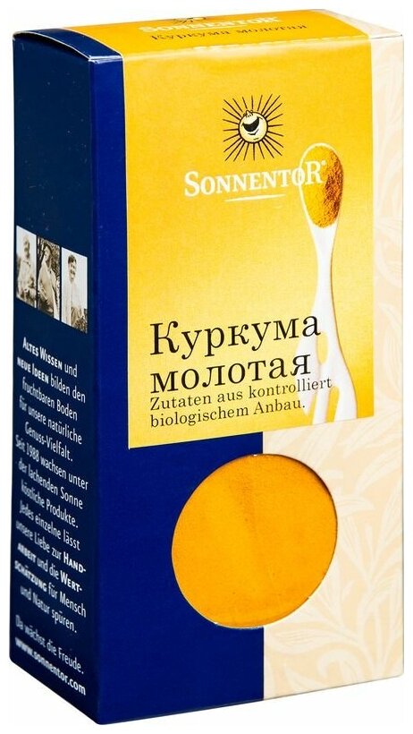 Куркума - самая "солнечная" специя. Ее ярко-желтый насыщенный вкус придает любому блюду энергию! В основном куркума используется как пряность. По вкусу куркума пряная, немного жгучая. Даже небольшое ее количество может придать блюду неповторимый вкус и аромат, что активно используют при приготовлении различных маринадов, соусов и десертов. Также куркума продлевает срок годности продуктов и дарит им свежесть. Состав: Куркума молотая. Sonnentor, Куркума молотая, 40 грамм.
