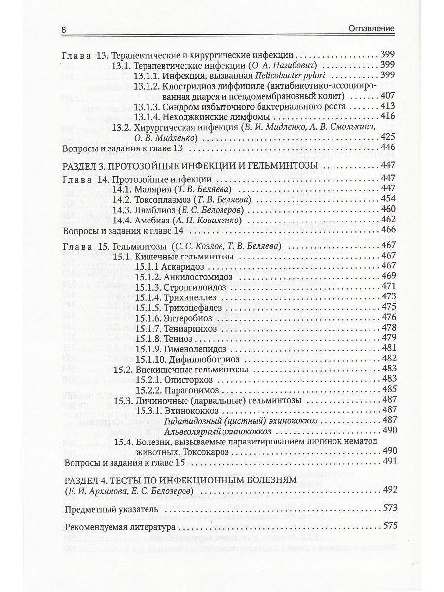 Увесистый учебник, рекомендованный для студентов медицинских ВУЗов. Описаны общие вопросы по инфекционным болезням, а также есть характеристика многих заболеваний, в частности вирусных болезней, гельминтозов, бактриозов, протозойных инфекций. Сам учебник неплохо структурирован, есть ч/б рисунки, схемы, таблицы. Каждая глава снабжена вопросами по теме. В конце цветная влейка в 4 листа.