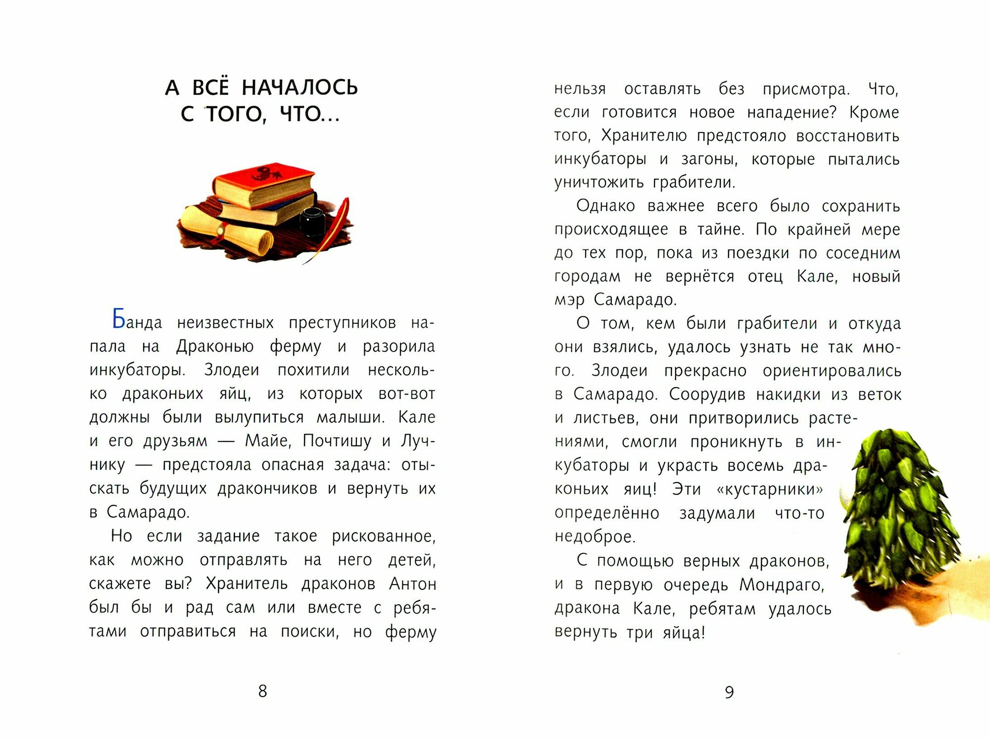 Добро пожаловать в волшебный мир, где каждый ребенок, когда ему исполняется одиннадцать лет, получает своего дракона! Существует шесть видов драконов: земли, огня, воды, ветра, льда и пещер. Нашему герою Кале достался дракон воды. Мондраго - дракон необычный: летать не умеет, но обожает плавать, всего боится и постоянно чихает. Однако Мондраго не раз выручал своего хозяина во время опасных приключений, которые постоянно сами находят Кале и его друзей. Ребятам удалось спасти уже трех драконьих малышей. Теперь они отправляются на поиски дракона воды. Кале и его друзьям предстоит расшифровать послание волшебной книги и даже пройти через Туманный лес! Для младшего школьного возраста.