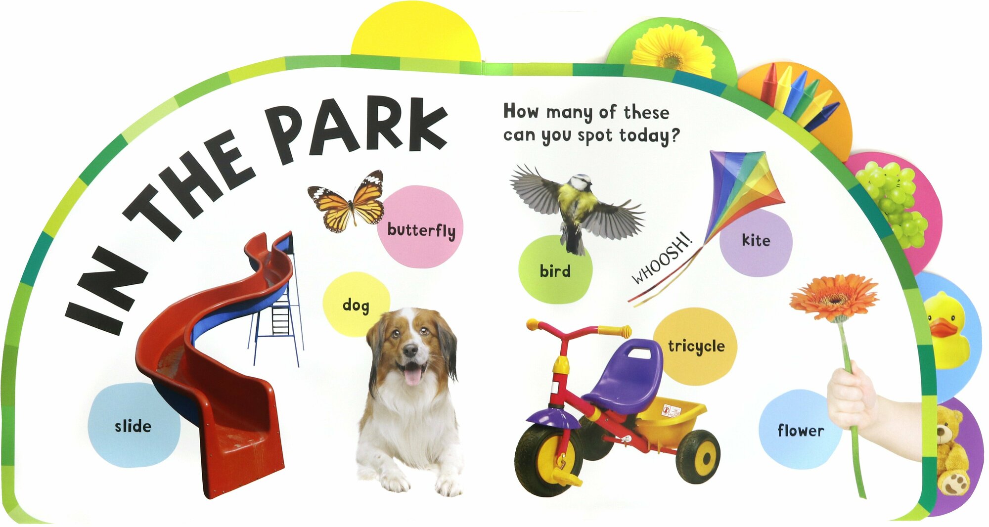 Take babies through their busy days with this curved board book, featuring sturdy tabs to make the pages easy for babies to select and turn. Introduce little ones to new vocabulary and first words by encouraging them to name and describe the photographs on each page. Packed with pictures of everyday objects baby will recognise from their busy day!