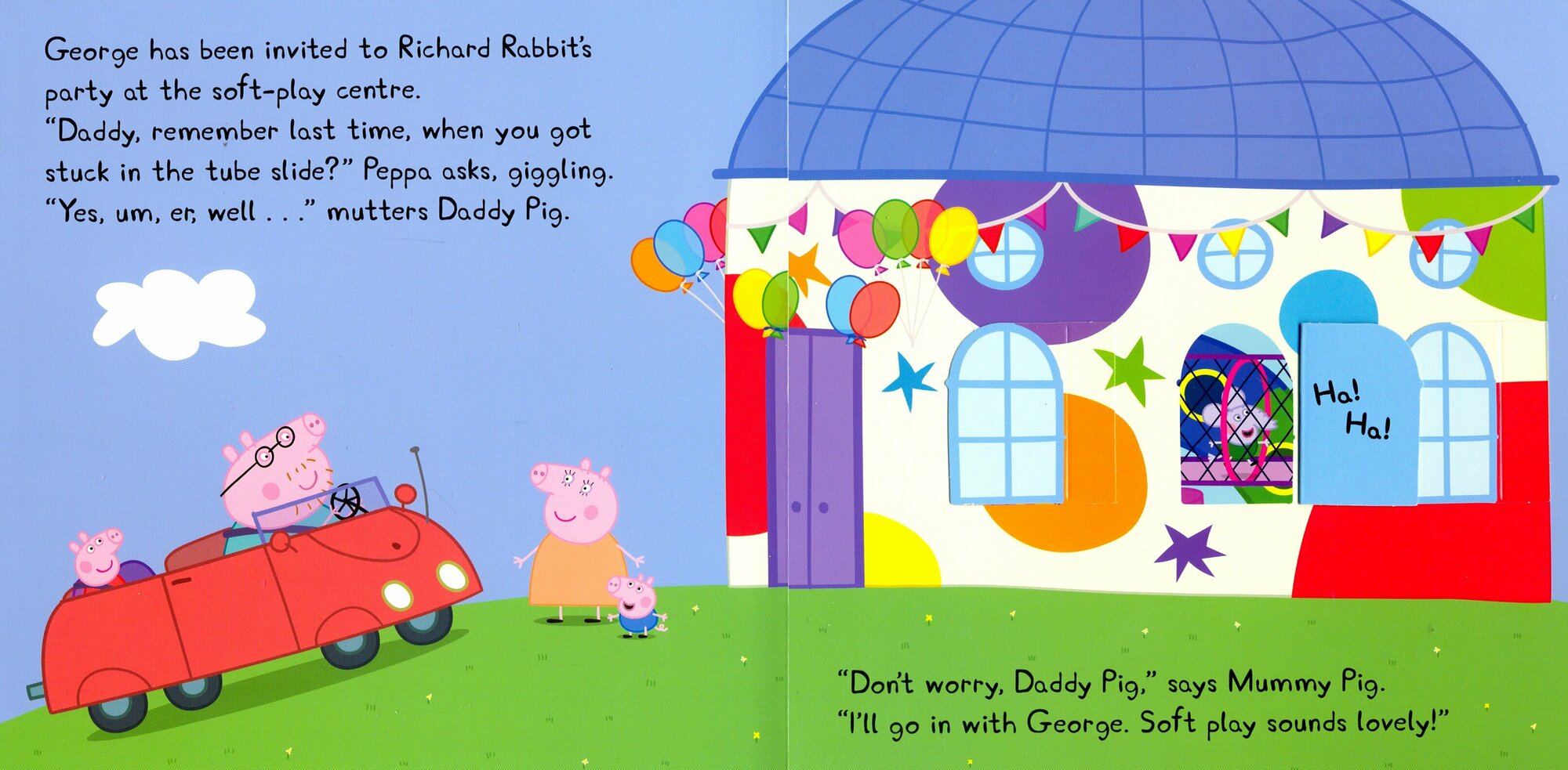 It's Richard Rabbit's birthday and he's having a party at the soft play centre! Peppa and George are very excited. They love soft play! The grown ups are a little bit less excited. They do not love soft play. They know that the children love soft play so much, that when it's time to go home, the grown ups have to go in after them but they always get stuck! Can Daddy Pig rescue the grown ups? Lift the flaps to find out in this fun lift-the-flap book!