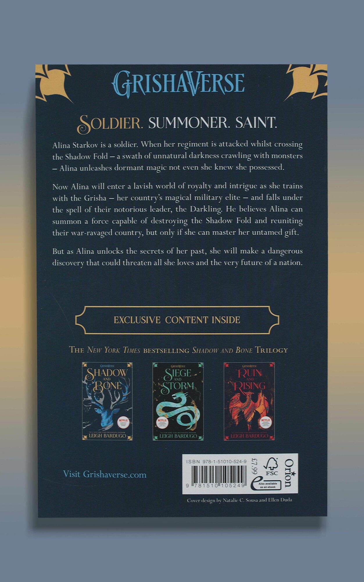 Soldier. Summoner. Saint. Orphaned and expendable, Alina Starkov is a soldier who knows she may not survive her first trek across the Shadow Fold - a swath of unnatural darkness crawling with monsters. But when her regiment is attacked, Alina unleashes dormant magic not even she knew she possessed.