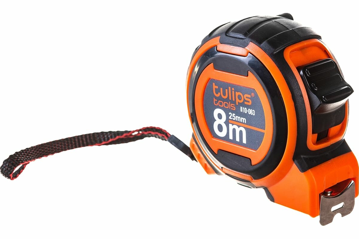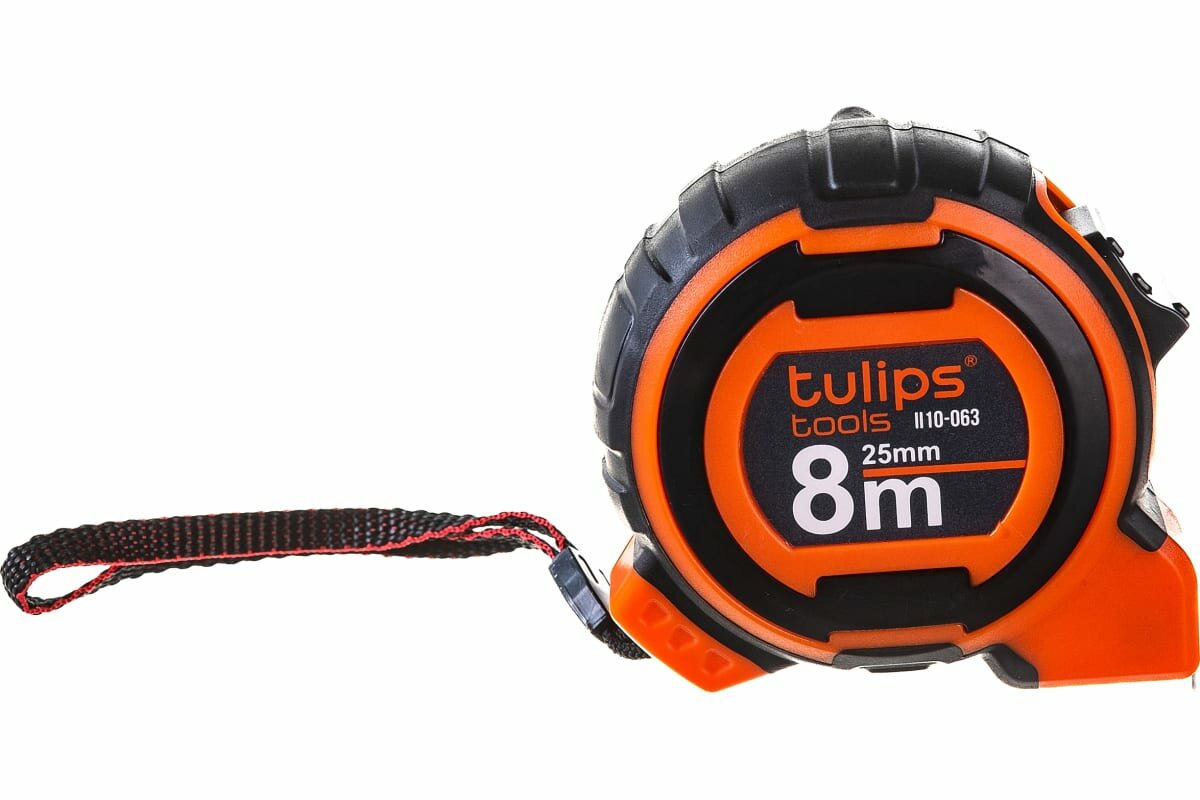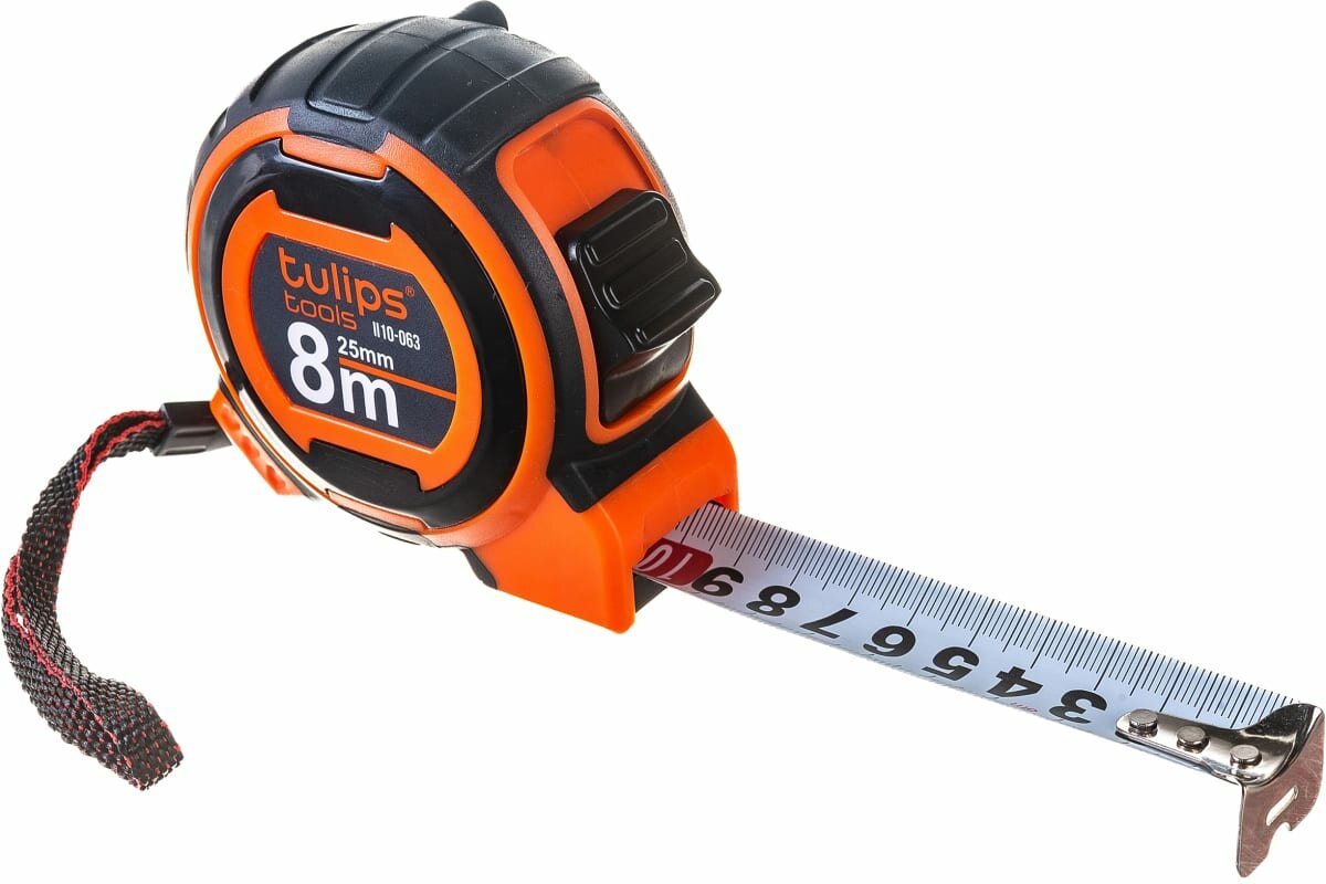 Рулетка TULIPS TOOLS артикул длиной 8 метров с шириной ленты 25 мм имеет 2-ой класс точности. Рулетка снабжена 1 фиксатором полотна, имеет усиленную пружину и автоматически сматывается в корпус. Выгнутая в сечении для большей жесткости стальная лента рулетки – белая, с односторонней шкалой, имеет матовое покрытие. Увеличенный подвижный односторонний крючок с прорезью закреплен на 3 заклепки. Ударопрочный эргономичный обрезиненный корпус оснащен зажимом для крепления рулетки к поясу и тесьмой для ее фиксации на руке.