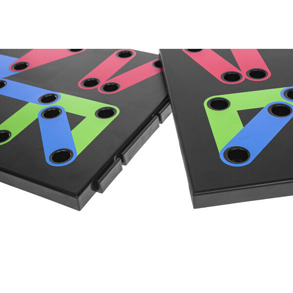 | Подготовка к работе | Соберите платформу из 2 частей, плотно соединив пазы. Для предотвращения скольжения платформы по гладкому покрытию вставьте специальные резиновые накладки в отверстия с обратной стороны панели. В соответствии с цветовой схемой вставьте упоры в симметричные отверстия с двух сторон платформы: Проверьте прочность установки упоров. Меняйте положения упоров для проработки разных групп мышц. |