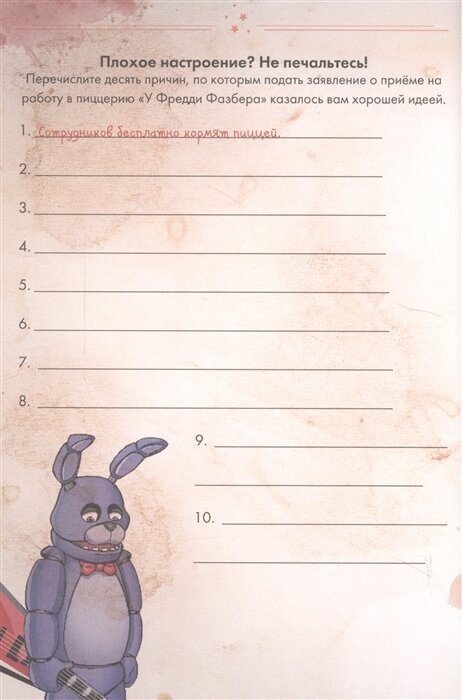 Глупо говорить,что, мол, в книге "страницы журнала будто испачканы грязью и в пятнах крови". Серия игр "Five night at Freddy" некогда не задумывалась как детское развлечение. И раз уж ваш ребёнок попросил эту книгу, то он наверняка знает, что происходить с этими играми. Вы либо фильтруйте то, чем увлекается ваше дитя, либо поймите, что в наше время дети не чураются жестокости в плане того, что этого всего не боятся.