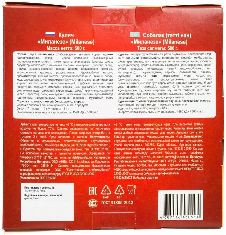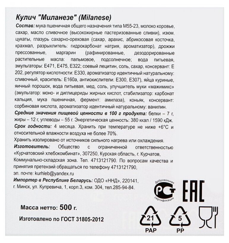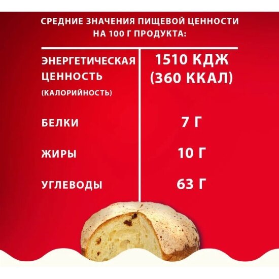 | Состав | Мука пшеничная общего назначения типа М55-23, молоко коровье, сахар, изюм, масло сливочное (коровье), цукаты, глазурь сахарно-ореховая, дрожжи прессованные, маргарин, яйца куриные, яичный порошок, вода питьевая, мед, соль, улучшитель муки "мажимикс", коньяк, консервант |