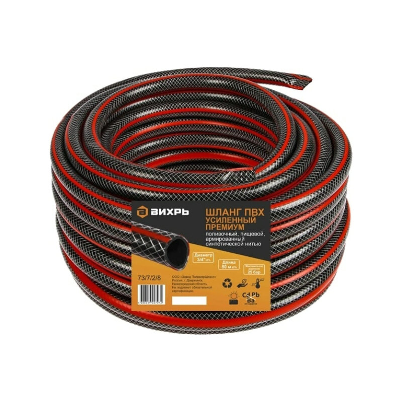 Шланг Вихрь поливочный усиленный, премиум качества предназначен для полива земельных участков, газона и других подобных поверхностей. Шланг выполнен из высококачественного ПВХ-материала, армированного трёхслойной нейлоновой нитью. Данная модель шланга является лучшей в своём классе.