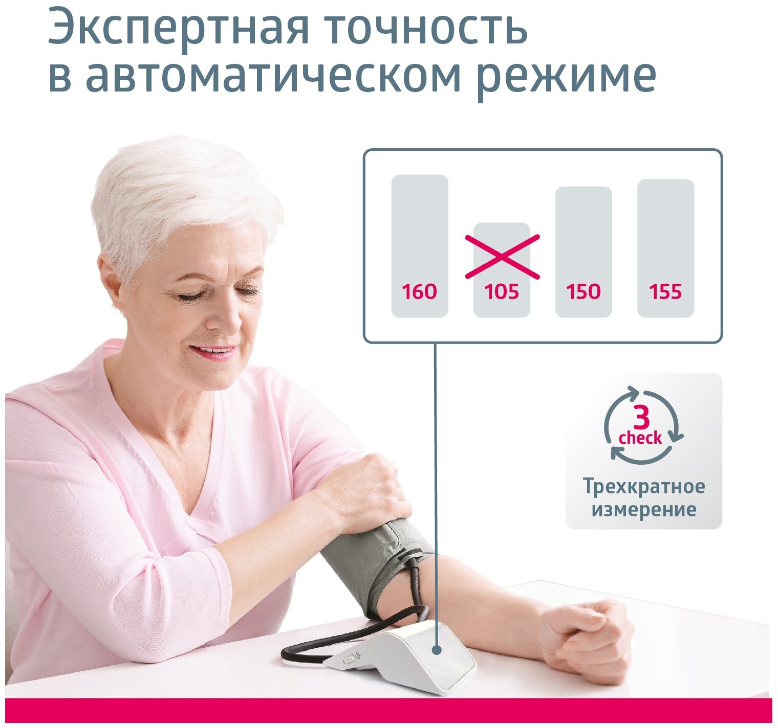 На показания давления влияют волнение, усталость, наличие аритмии. Поэтому врачи рекомендуют проводить, как минимум, 2 измерения и вычислять среднее значение. Технология 3Check создана в соответствии с рекомендациями Всемирной Организации Здравоохранения по контролю давления