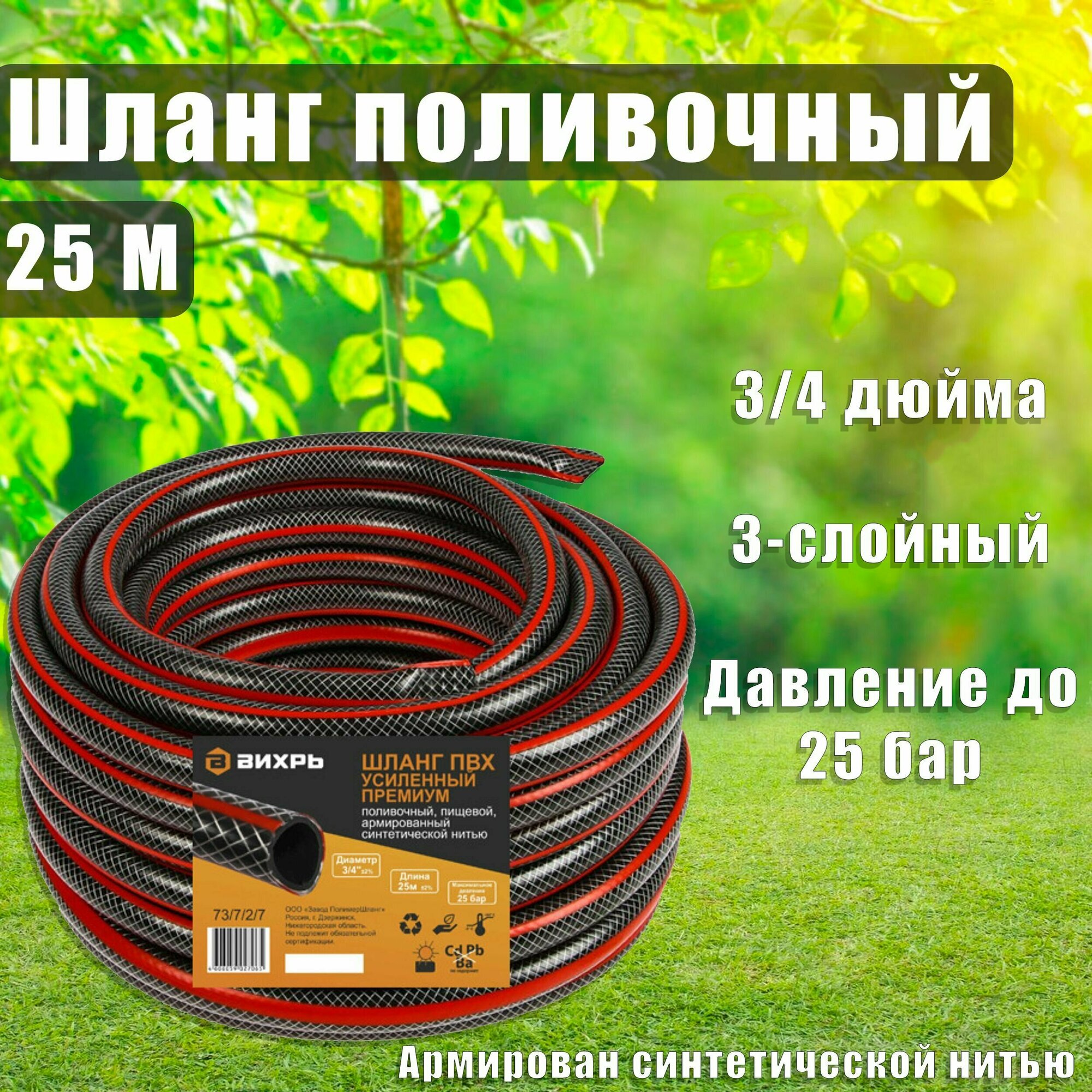 | Описание | Армированный усиленный поливочный шланг Вихрь премиум, ПВХ, пищевой, трехслойный, 3/4", 25 м 73/7/2/7 применяется для полива частных участков. |
