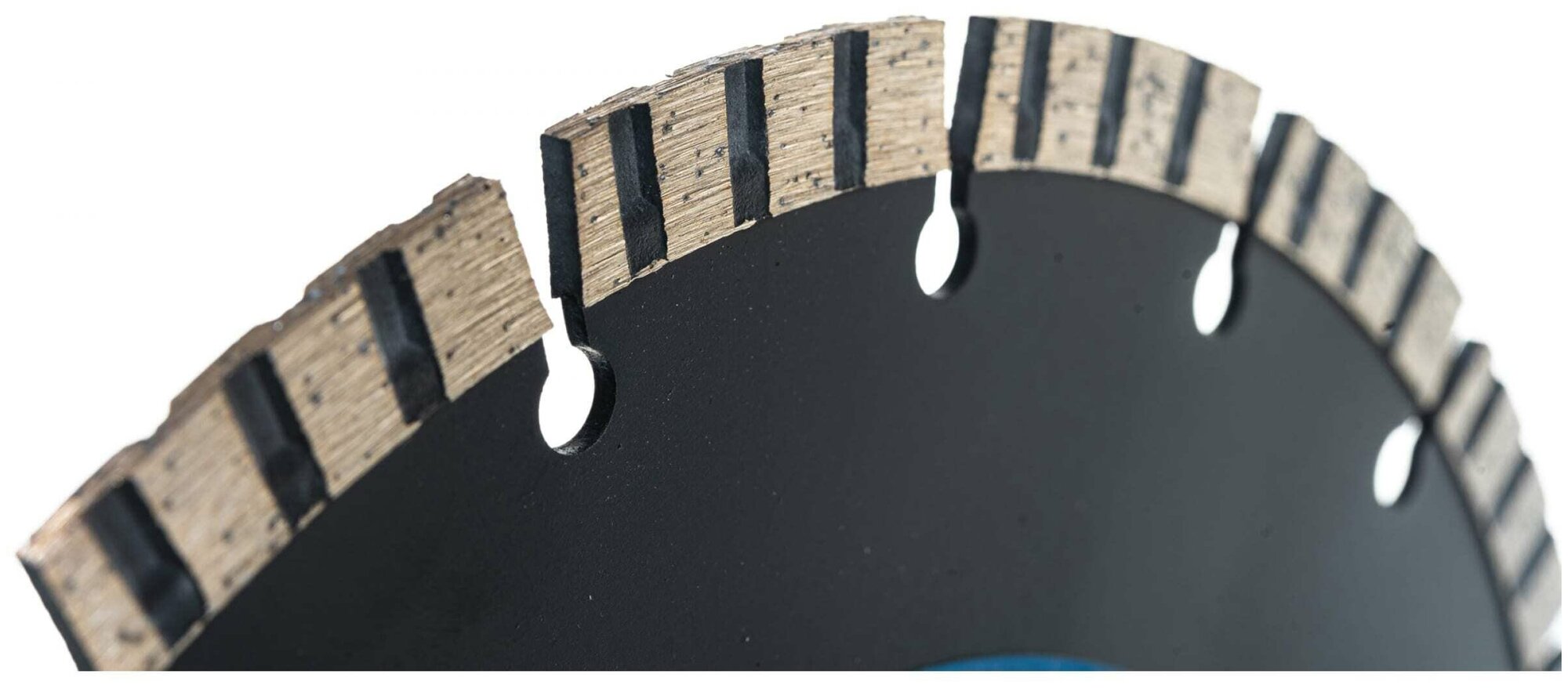 | Прочие особенности и свойства | Компенсационные отверстия снижают вибрацию диска во время работы. Для долгой службы оснастки необходимо соблюдать следующие правила:процесс непрерывной работы должен быть не более 60-90 секунд, а охлаждение на холостом ходу не менее 20 секунд. Данный диск не применяют для реза или шлифования изделий из металла. Чтобы восстановить режущие способности оснастки, необходимо произвести несколько одновременных резов по однородному абразивному материалу. |