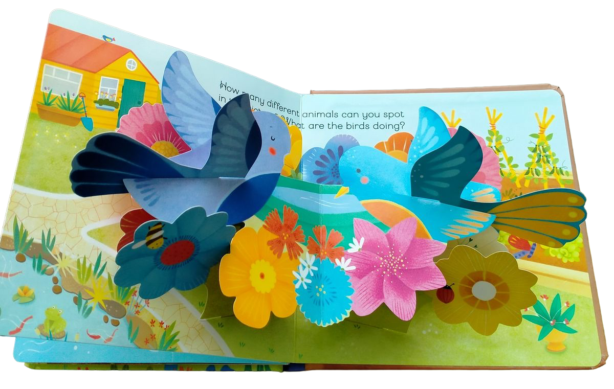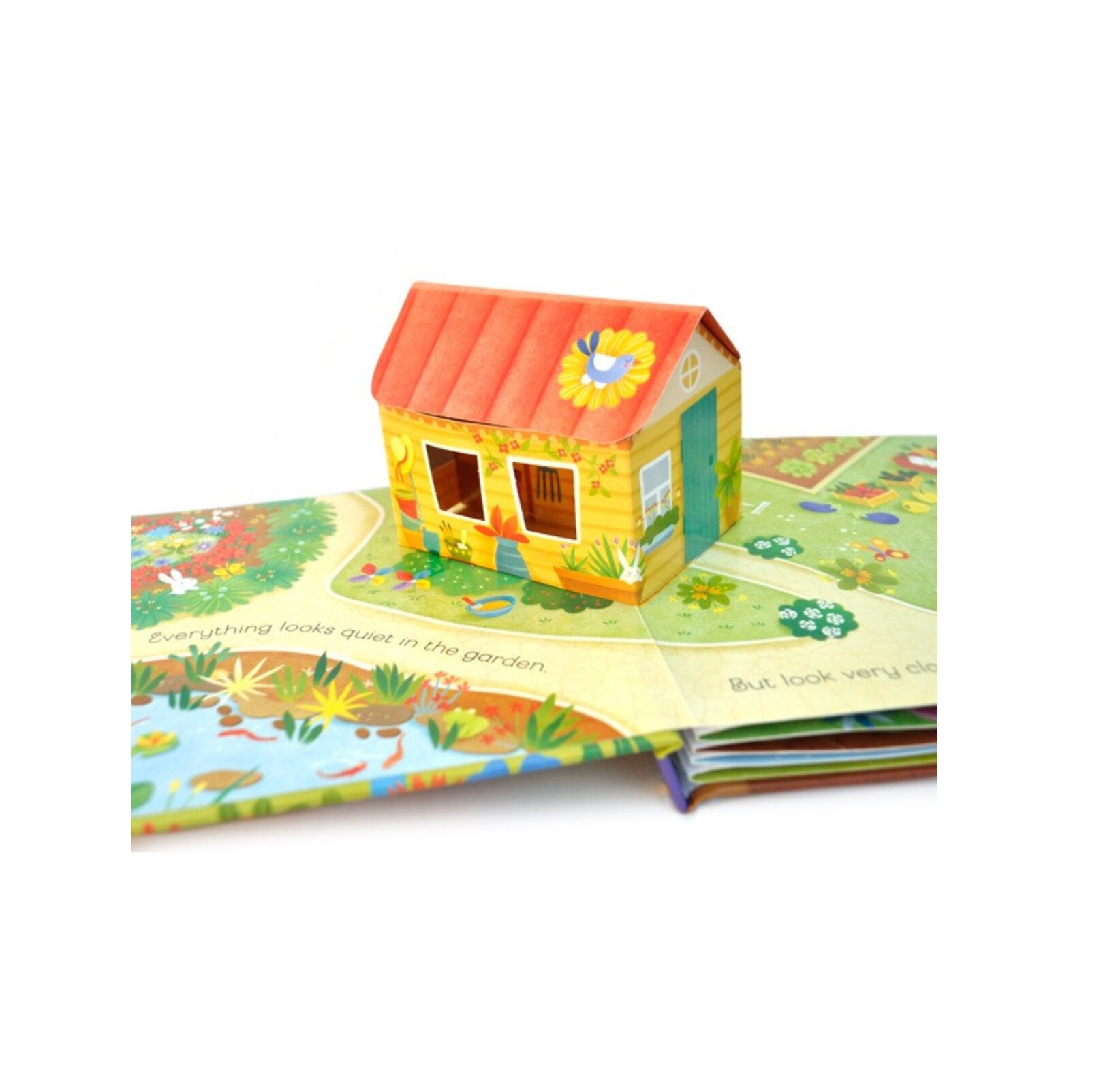 Замечательная книга от известного издательства Usborne. Книга квадратного формата примерно 18,5 на 18,5 см из плотного картона с поп-ап элементами, всего 10 страниц. Данная книга про сад, в ней есть небольшой текст и несколько заданий на каждой странице. Яркие иллюстрации и поп-ап элементы привлекут внимание малышей, и чтение книги превратится в мини театр. Книга подойдёт для чтения родителями для малышей, а также для детей постарше для самостоятельного чтения. Единственное это то, что малышам в руки книгу не давать без родителей, могут оторвать поп-ап элементы.