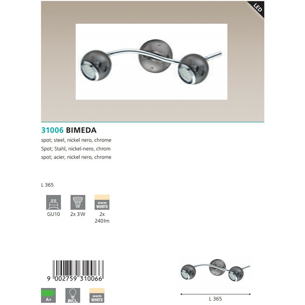 Спот с двумя плафонами Eglo серии BIMEDA. Придаст особый шарм вашему интерьеру. Размеры 36.5x0x36.5 cm. Параметры пылевлагозащиты IP — 20. Плафон металлический черного цвета, а материал/цвет арматуры металл/черный. Использует 2 лампы с цоколем GU10. Площадь освещения охватывает 3 m². Идеально подходит для офиса, для гостиной, для прихожей, для спальни. Страна происхождения бренда — АВСТРИЯ.