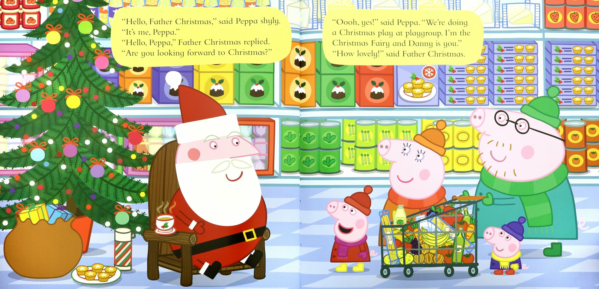 All the children are dressed up in their fabulous costumes, and after a chance meeting at the supermarket, Peppa has invited Father Christmas to come along.