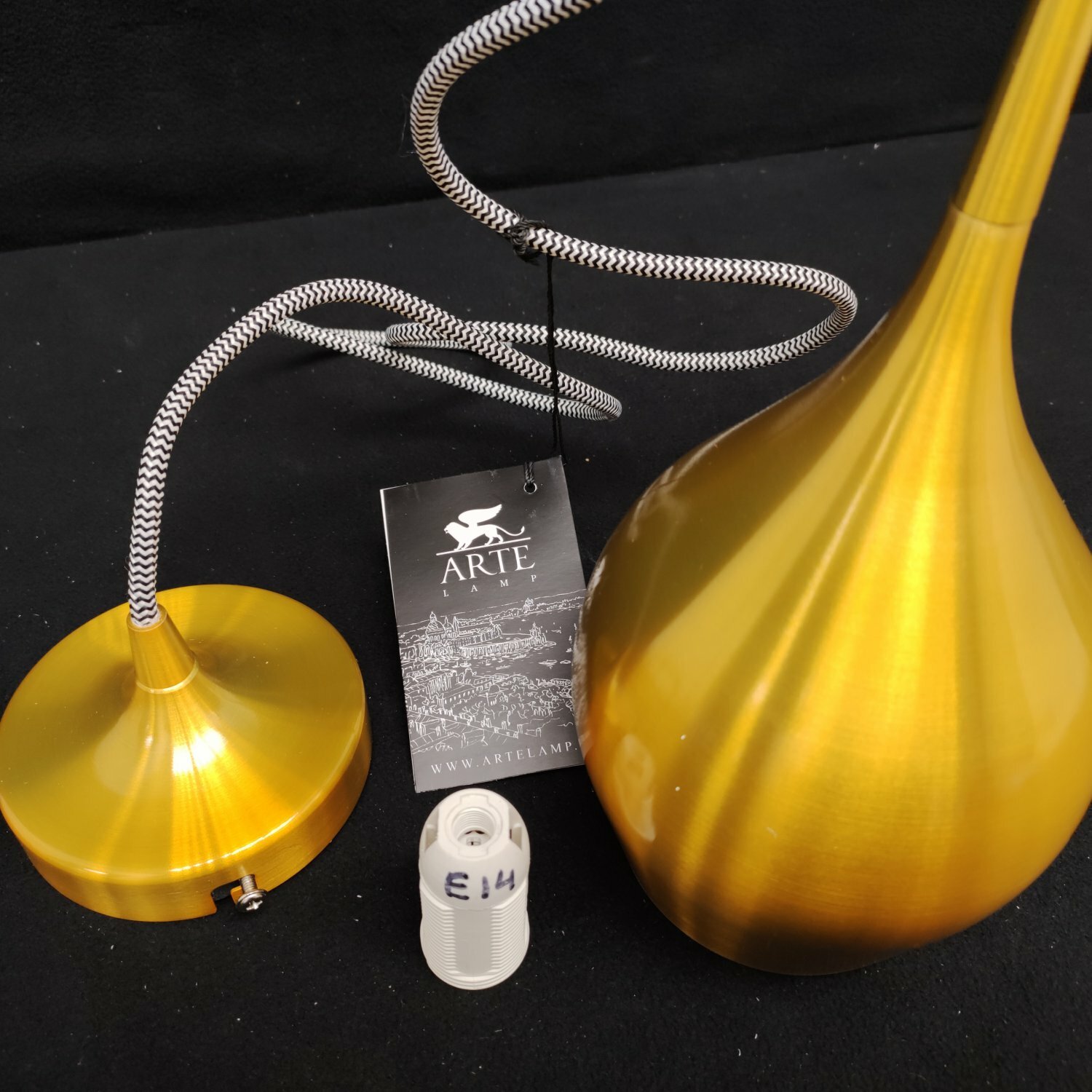 Светильник Artelamp A6412SP-1GO серии Vibrant. Подчеркнет стиль помещения. Размеры 12x12x23 cm. Параметры пылевлагозащиты IP — 20. Форма конусная. Плафон алюминевый золотистый, а материал/цвет арматуры металл/золотистый. Использует 1 лампу с цоколем E14. Площадь освещения охватывает 2.25 m². Идеально подходит для кухни или кафе и ресторанов. Страна происхождения бренда — Италия.