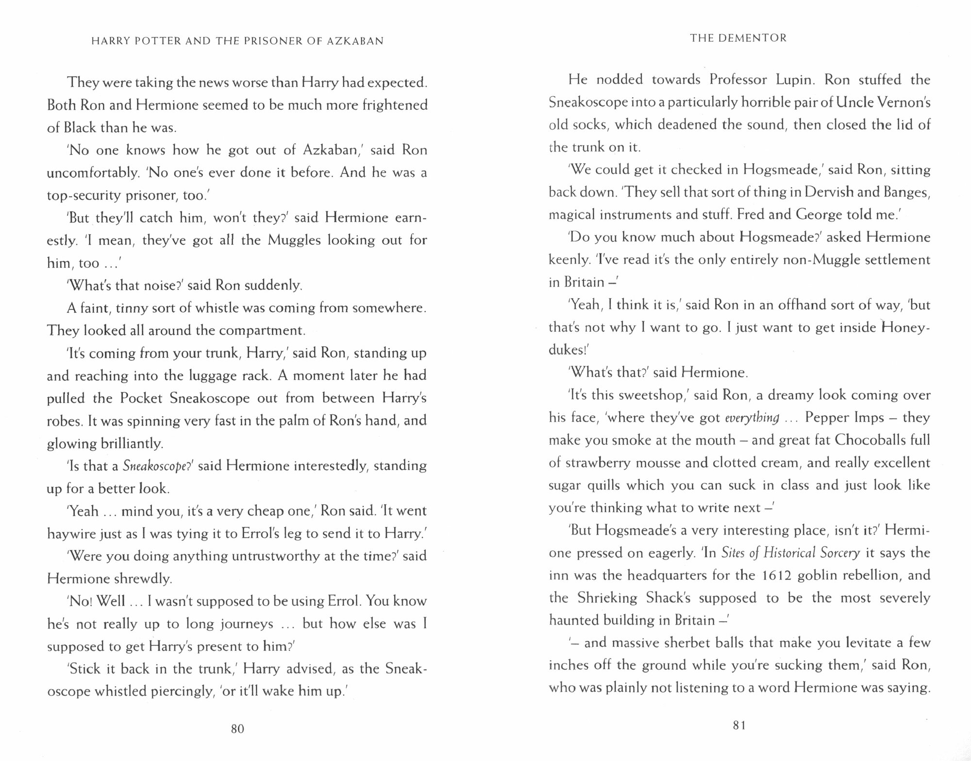 В книге «Гарри Поттер и узник Азкабана» Гарри Поттер и его друзья становятся заметно взрослее. На смену невинным шуткам и шалостям приходят более серьезные проблемы. Если в первых двух книгах автор намекает на противостояние между силами добра и зла, то в третьей книге о Гарри Поттере на кону стоят жизни волшебников и волшебных существ. Браво автору за то, что создала такую динамичную, эмоциональную и вместе с тем трогательную развязку. С первых страниц и аж до середины книги, кажется, что враг юных волшебников известен, но ближе к концу автору удалось внести неожиданный поворот, который я и представить себе не могла. Это сделало книгу запоминающейся и яркой. Третья книга о Гарри Поттере ничем не уступает предыдущим. Разница лишь в том, что, как сами волшебники, так и их главный противник становятся еще сильнее. За этим противостоянием очень интересно наблюдать.