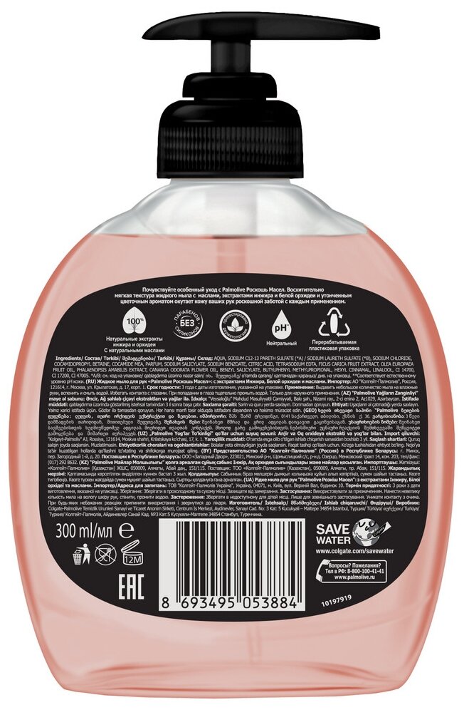 Почувствуйте особенный уход с Palmolive Роскошь Масел с экстрактами инжира, белой орхидеи и маслами. Восхитительно мягкая текстура жидкого мыла с маслами, экстрактами инжира, белой орхидеи и утонченным цветочным ароматом окутает кожу ваших рук роскошной заботой с каждым применением. Экстракт инжира смягчает, питает и увлажняет кожу. Экстракт орхидеи обладает выраженным питательным и увлажняющим действием.