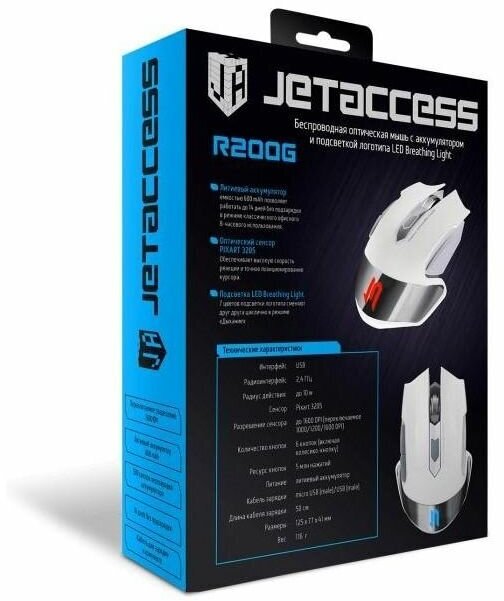 Jet.A R200G - универсальная беспроводная мышь премиум класса со встроенным аккумулятором и деликатной подсветкой LED Breathing Light. Встроенный аккумулятор емкостью 600 mAh позволяет в обычном офисном 8-часовом режиме работать до 14 дней. Стильный современный дизайн модели позволяет ей органично вписываться как в офисную обстановку, так и в домашний интерьер.