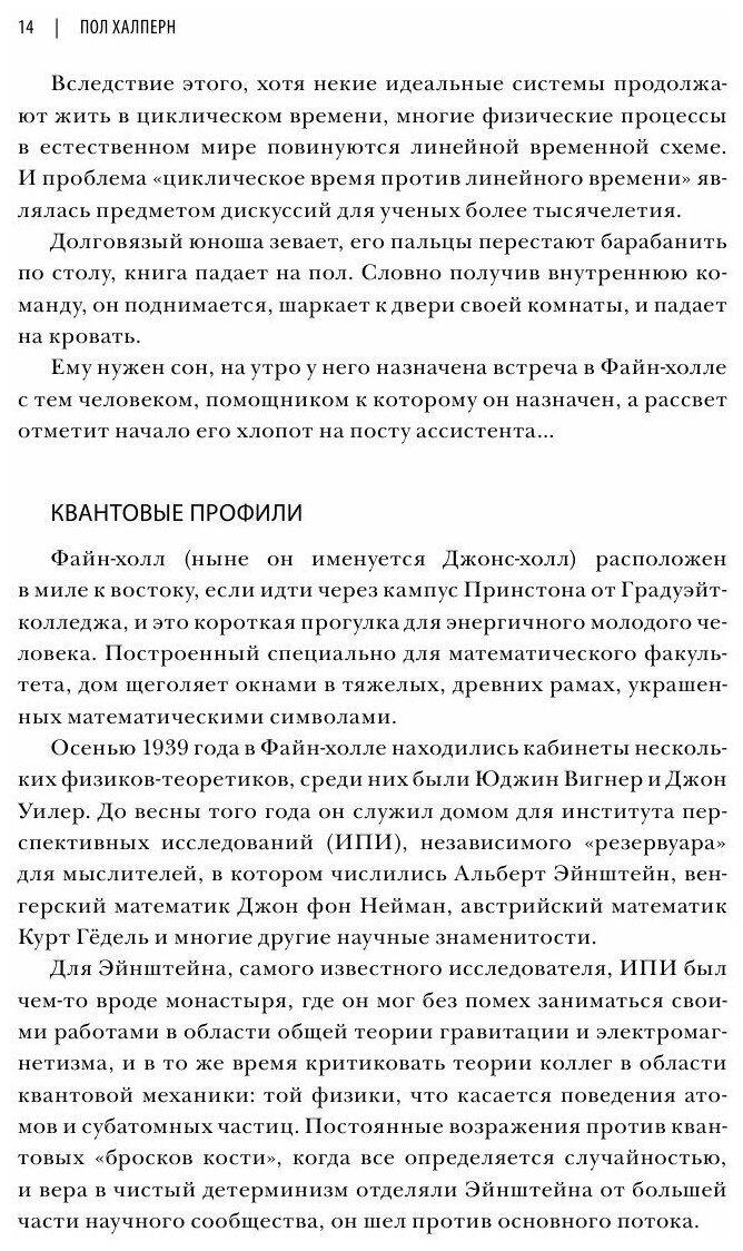 Учиться физике по Фейнману тяжело. «Фейнмановские лекции по физике» косноязычны и велеречивы. Более полезны профессионально написанные книги типа «Статфизика» или «Диаграммы», но там все чересчур специально и конкретно. Для только погружающихся в большую науку наиболее интересны описания полета мысли, которые рассыпаны Фейнманом в разных своих публикациях. Книга Халперна – как раз концентрация истории продуцирования и эволюции этих многочисленных безумных идей. Поскольку Халперн сам – физик, физические идеи выражены им максимально грамотно и доступно для литературы популярной. Хотя многие вопросы подробно освещались в литературе (вселенная из одного электрона; электрон, движущийся вспять во времени и проч.), книги Халперна содержат массу новых деталей, отчего читаются так увлекательно. Здесь стоит вспомнить и его предшествующую, вольно поименованную в русском переводе книгу «Играют ли коты в кости».