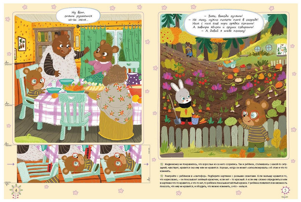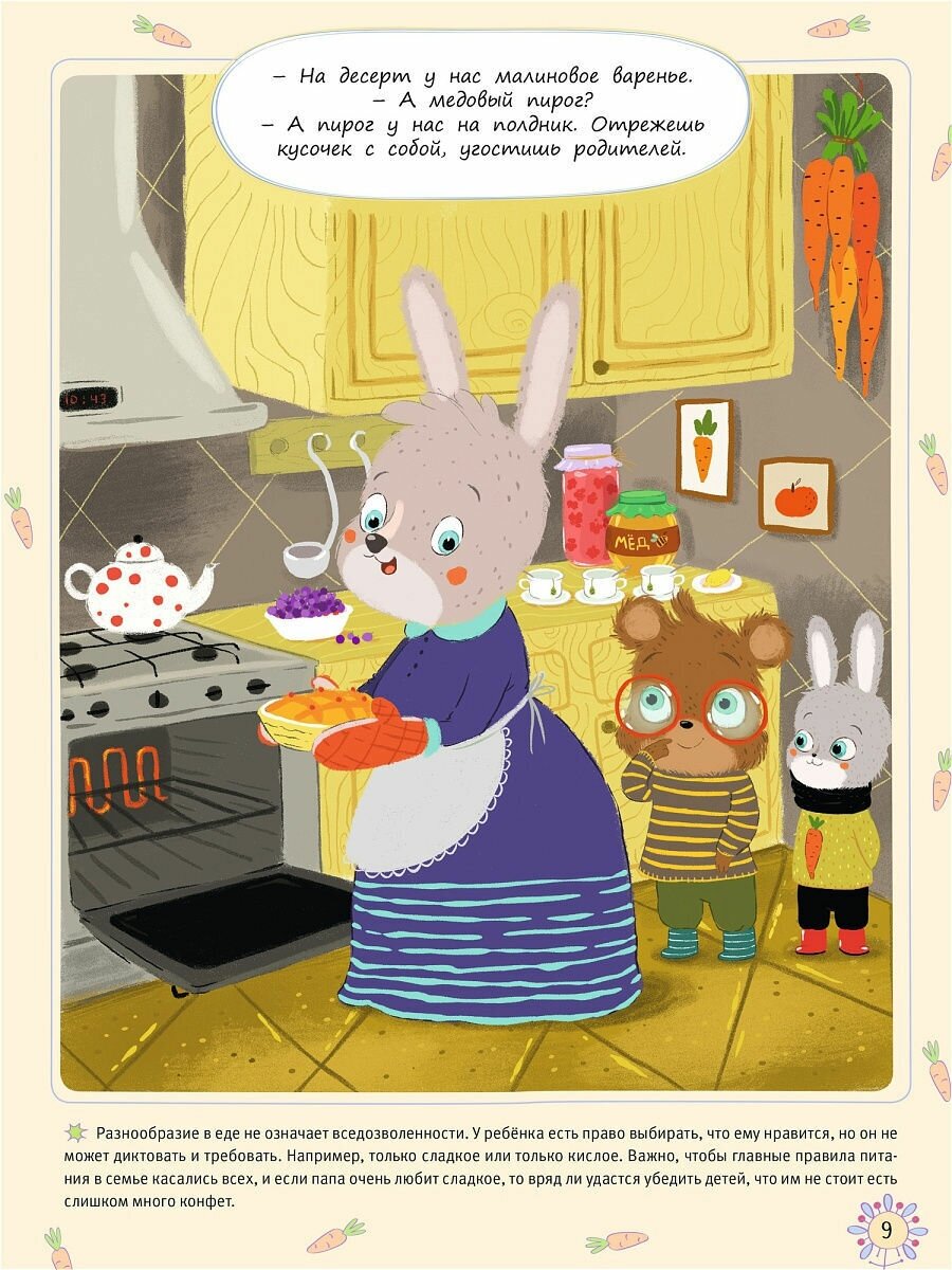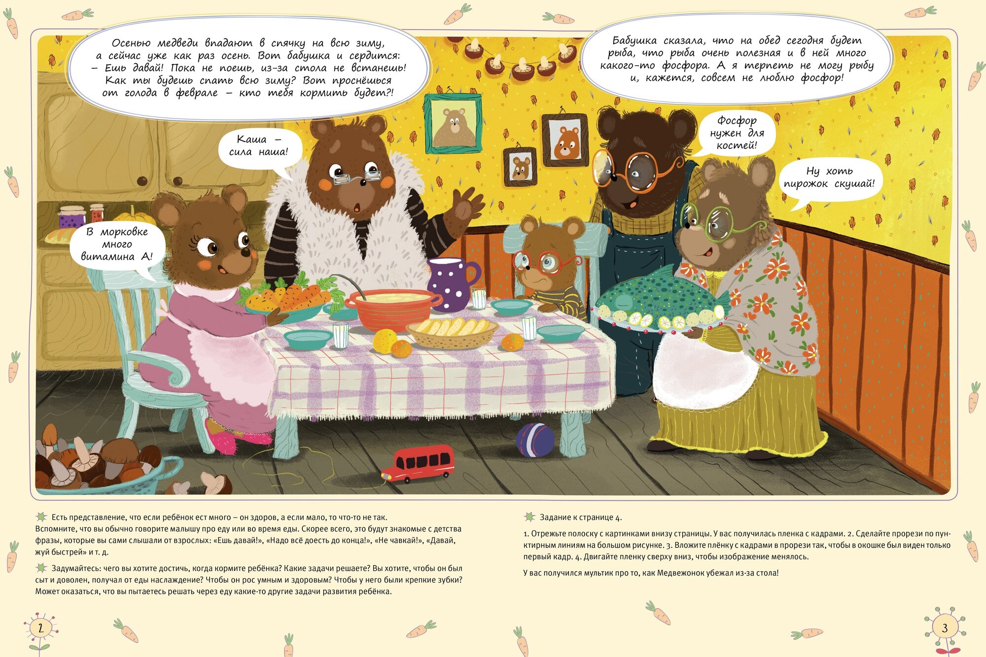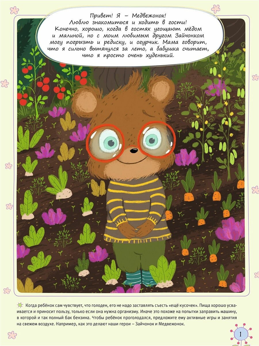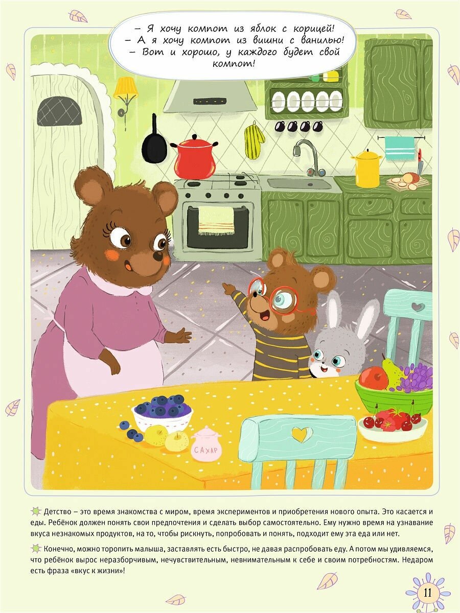 Чудесная книга! Тот случай, когда сама мама может быть психологом своему ребенку! Если уже появилась проблема с питанием (ребенок ест мало/много, слишком разборчив в еде, ест одно и то же), можно бережно поисследовать эту тему. Для малыша это просто история про зверят: Медвежонка и Зайчонка. С ними за компанию можно поговорить о том, что нравится из еды больше всего, а что - меньше всего (и за такие разговоры не получишь упреков). С героями можно поиграть в игры про разные блюда, нарисовать мультик, взять интервью у родителей... Другими словами, незаметно, поисследовать тему, ДОБРОЖЕЛАТЕЛЬНО рассказать и послушать друг друга. А родители в книжке найдут советы, понаблюдают за собой и за своим малышом, осознают, что и они едят не все и не всегда)) И одно это исследование может снять напряжение с темы, и проблема может сама собой исчезнуть.