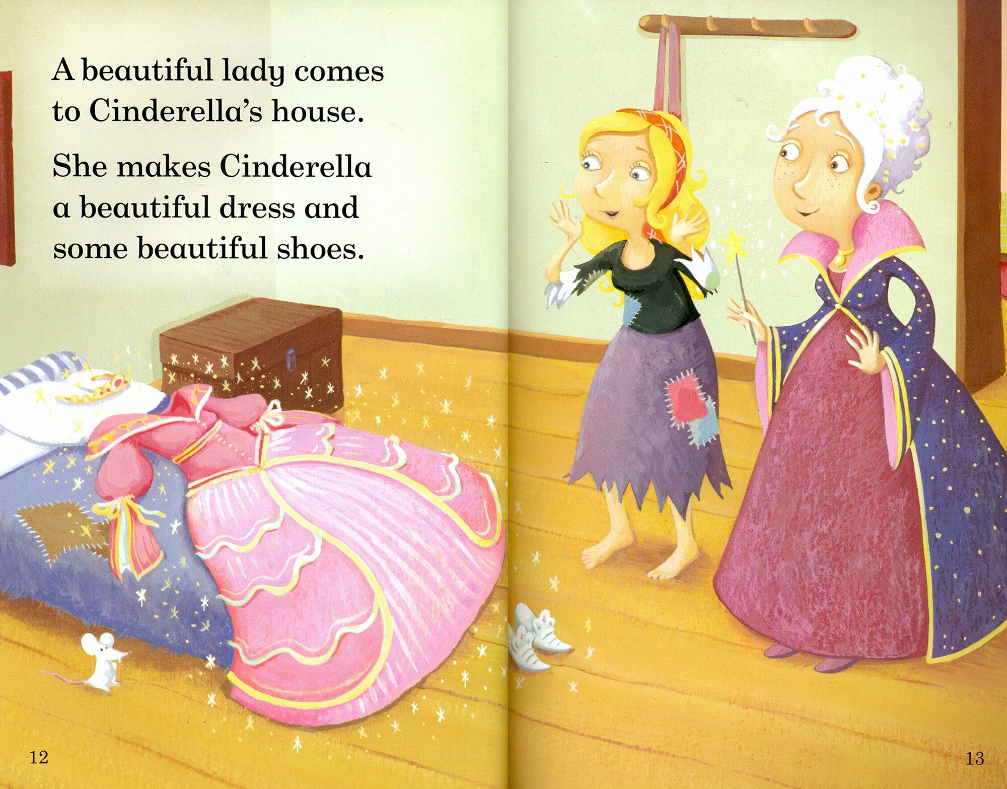 A beautiful lady comes to Cinderella's house. She makes Cinderella a dress. Now, Cinderella can go to the ball!