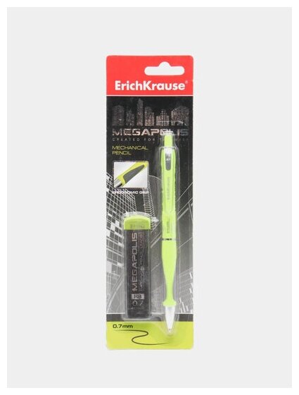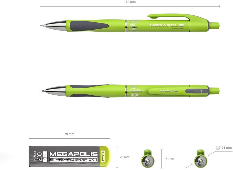 Механический карандаш с металлическим наконечником и убирающейся цангой. Карандаш имеет круглый неоновый корпус с эргономичной грип-зоной, оснащенной двумя резиновыми вставками. Твердость HB. Диаметр грифеля - 0.7 мм. Модель MEGAPOLIS® Concept имеет узнаваемую запатентованную форму, обладает великолепной эргономикой и стала одним из бестселлеров в ассортименте механических карандашей ErichKrause® более чем в пятидесяти странах мира.