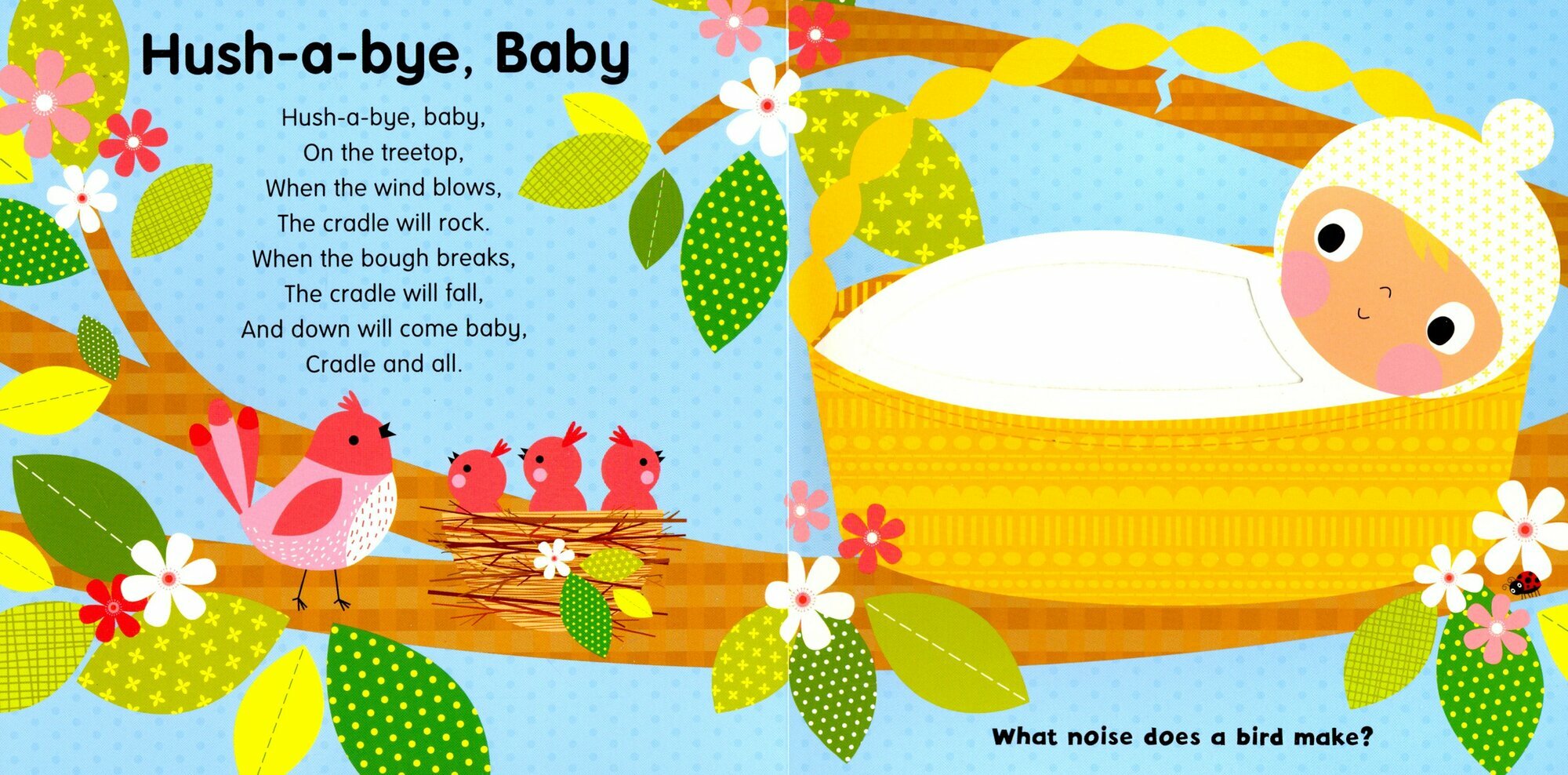 Книга понравилась, долго сомневалась стоит ли брать, и в итоге рада, что добавила в заказ. Из колыбельных знала только Twinkle Twinkle, остальные тоже интересные и некоторые достаточно необычные (текст). На каждом развороте 1 песенка с иллюстрацией и сенсорной вставкой. Всего 5 коротких песенок. Очень приятные картинки, много интересных деталей (на развороте Wee Willie Winkle - разные малыши в окошках, Twinkle Twinkle - сова на дереве + вопрос внизу на каждом развороте, например what sound does a drum make?). Ещё книга размером побольше чем стандартные board books, тоже приятно