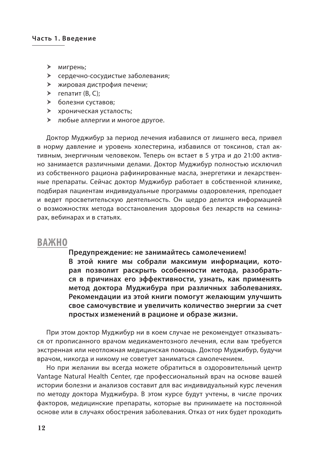 Методика доктора Муджибура - это уникальная авторская методика оздоровления, которая сочетает современную и нетрадиционную медицины. Она поможет эффективно излечиться от более чем 60 видов дегенеративных заболеваний, таких как мигрень, диабет 2-го типа, хроническая усталость и аллергии. Комплексный подход, основанный на знаниях и понимании принципов функционирования наших внутренних органов, позволит взглянуть по-другому на свой организм и восстановить утраченное здоровье. Доступные для исполнения рекомендации и понятные рецепты позволят улучшить ваше состояние и помогут быть здоровым и успешным человеком здесь и сейчас.