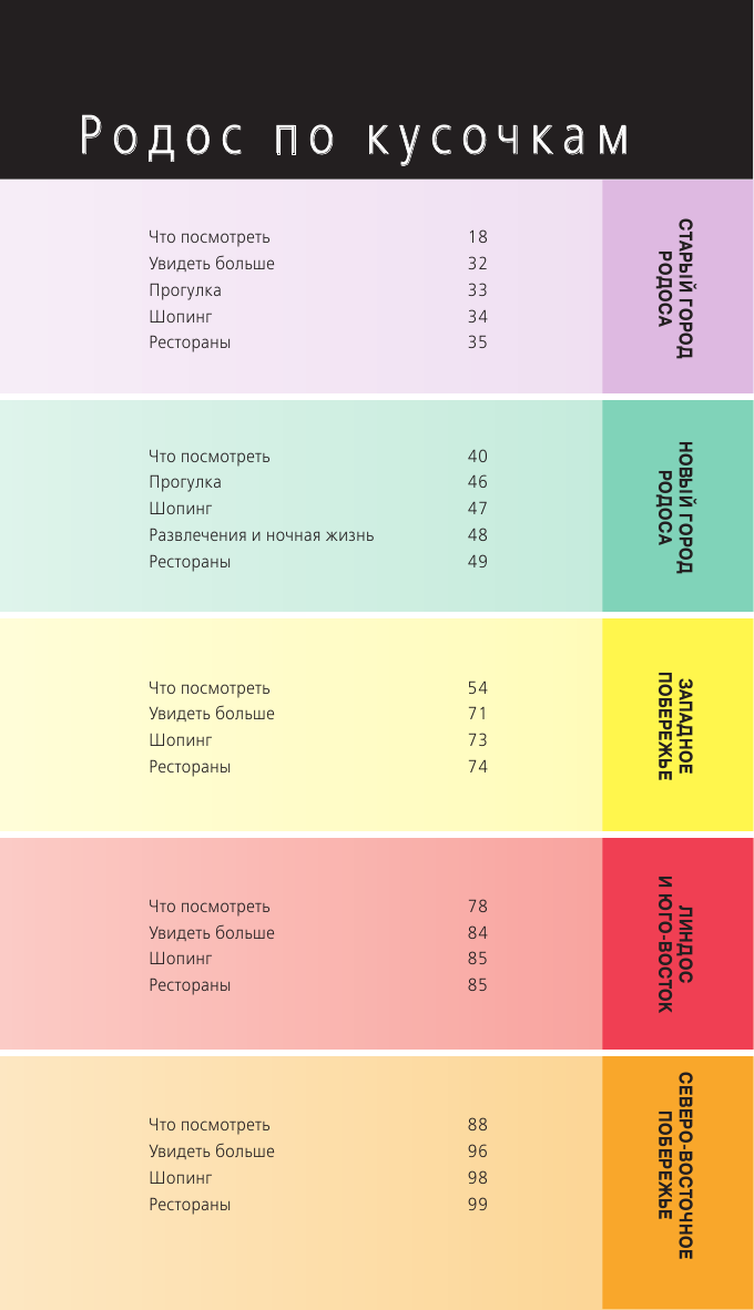 Хорошо подобрана информация по историческим местам и достопримечательностям, удобная сортировка. Отражены места, интересные как взрослым путешественникам, так и путешественникам с детьми. Единственное что не хватило мне, это отдельная (выделенная) информация по пляжам - где песок, где галька, где камни, платные, бесплатные, есть ли дополнительные услуги - все это распределено по всей книги, т.к. обзор идет по участкам острова. Чтобы понять, какой пляж выбрать, нужно прочитать всю книгу, но и здесь на мой взгляд информации недостаточно. Во всем остальном путеводитель просто отличный .