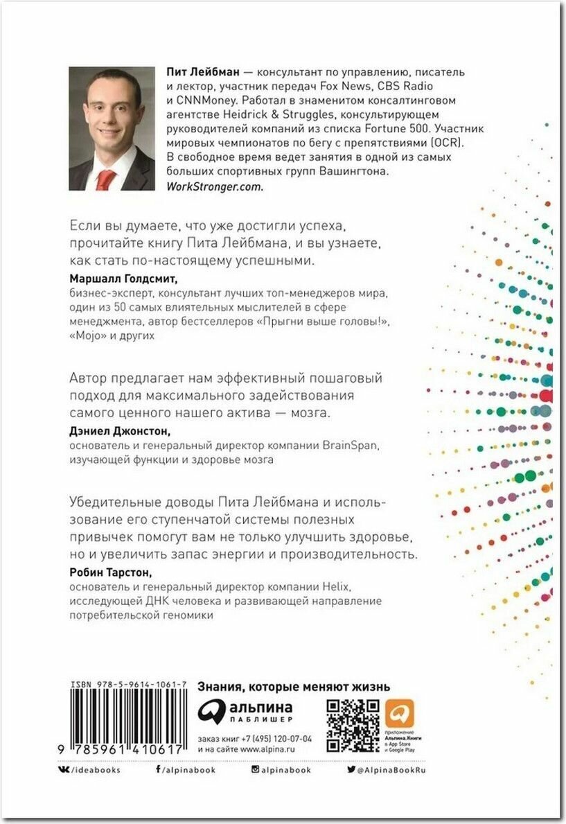 Если любимая работа больше не приносит удовольствия, а вы каждый день чувствуете себя как телефон, у которого осталось 5% зарядки, возможно, настало время пересмотреть свои привычки. Пит Лейбман, консультант по управлению, исследовал проблему снижения эффективности и мотивации. Он общался со многими успешными людьми ― общественными деятелями, спортсменами, руководителями крупных компаний ― и изучил привычки, которые позволяют им добиваться целей и держать планку, оставаясь счастливыми. Свои выводы он изложил в книге, подкрепив их яркими мотивирующими цитатами.Цитата«Процветающие люди не принуждают себя, чтобы добиваться успеха. Они вырабатывают эффективные привычки, принимая нестандартные решения и методично выстраивая свою жизнь». Пит ЛейбманЗачем читатьВы получите пошаговую схему приобретения привычек, которые придают сил и энергии, снижают стресс и тревожность, улучшают настроение, делают вас выносливым и продуктивным.Программа затрагивает четыре важнейшие жизненные сферы: питание, физическую активность, концентрацию внимания и восстановление.Лейбман подробно разбирает причины, мешающие нам жить полноценно, и предлагает способы их устранения. Приобретя полезные привычки, вы с удивлением обнаружите, что жизнь изменилась в лучшую сторону.